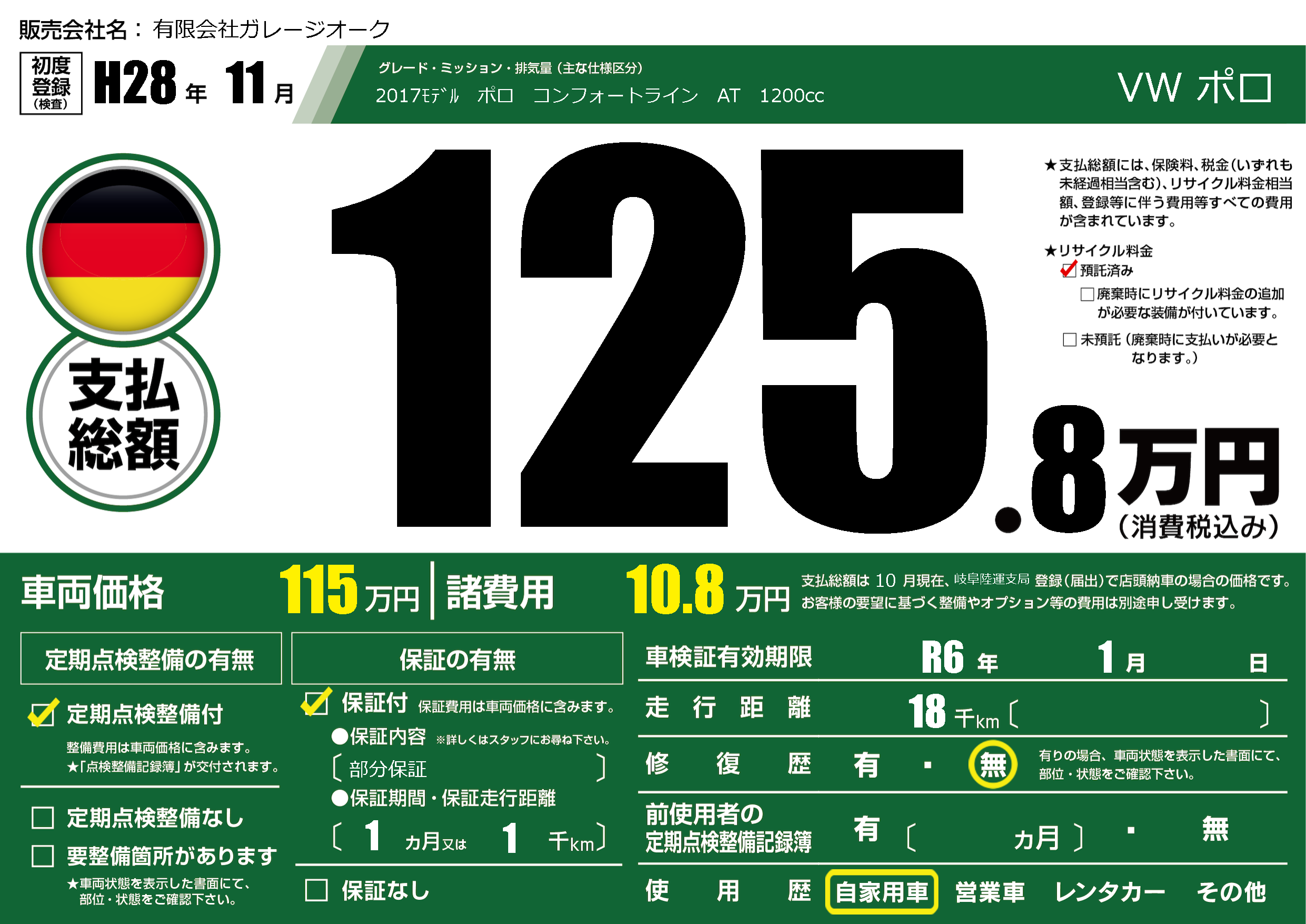 | 車名 | VW ポロ | グレード ミッション 排気量 |