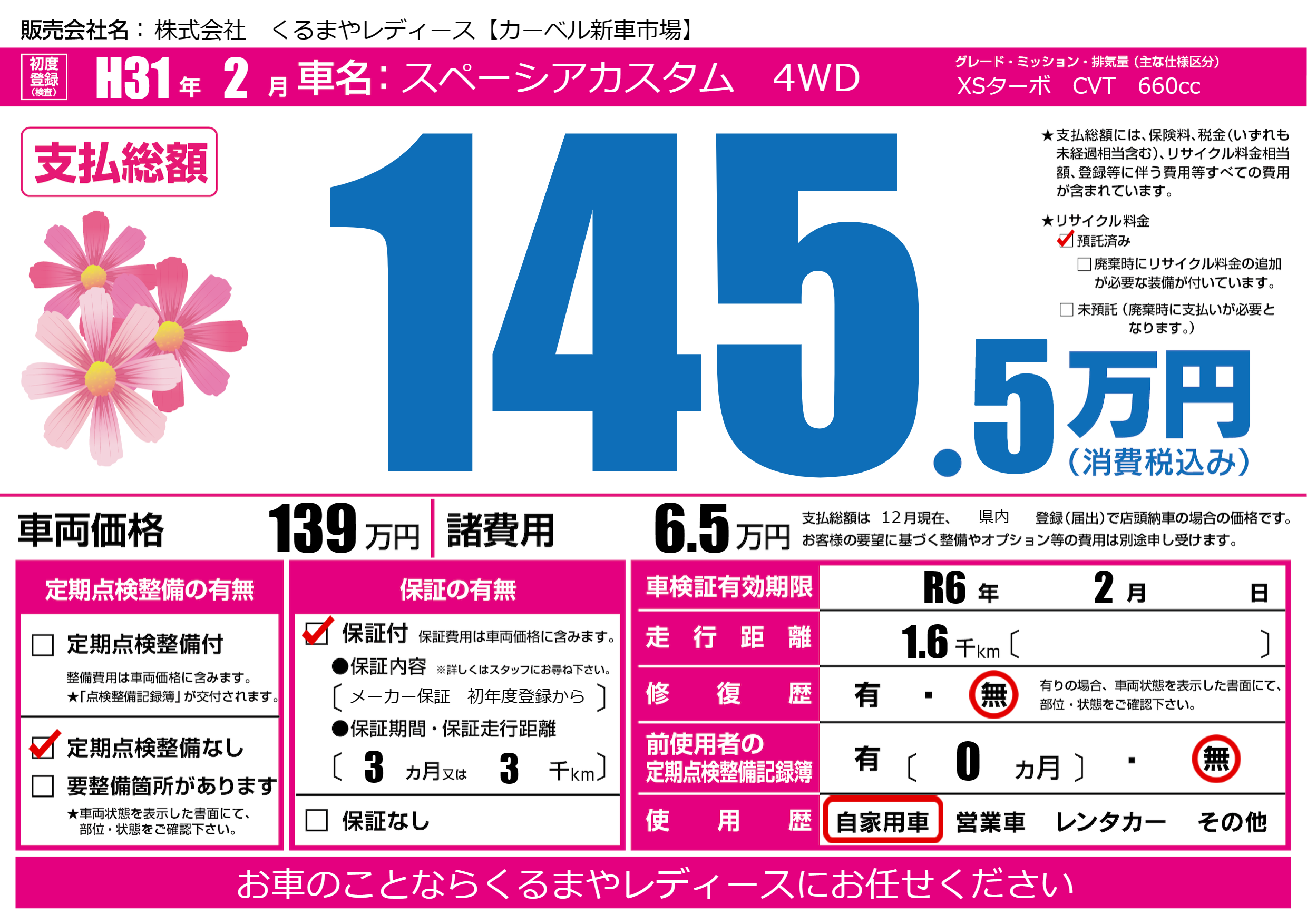 なし | 車検制限 | R6年2月---月 |