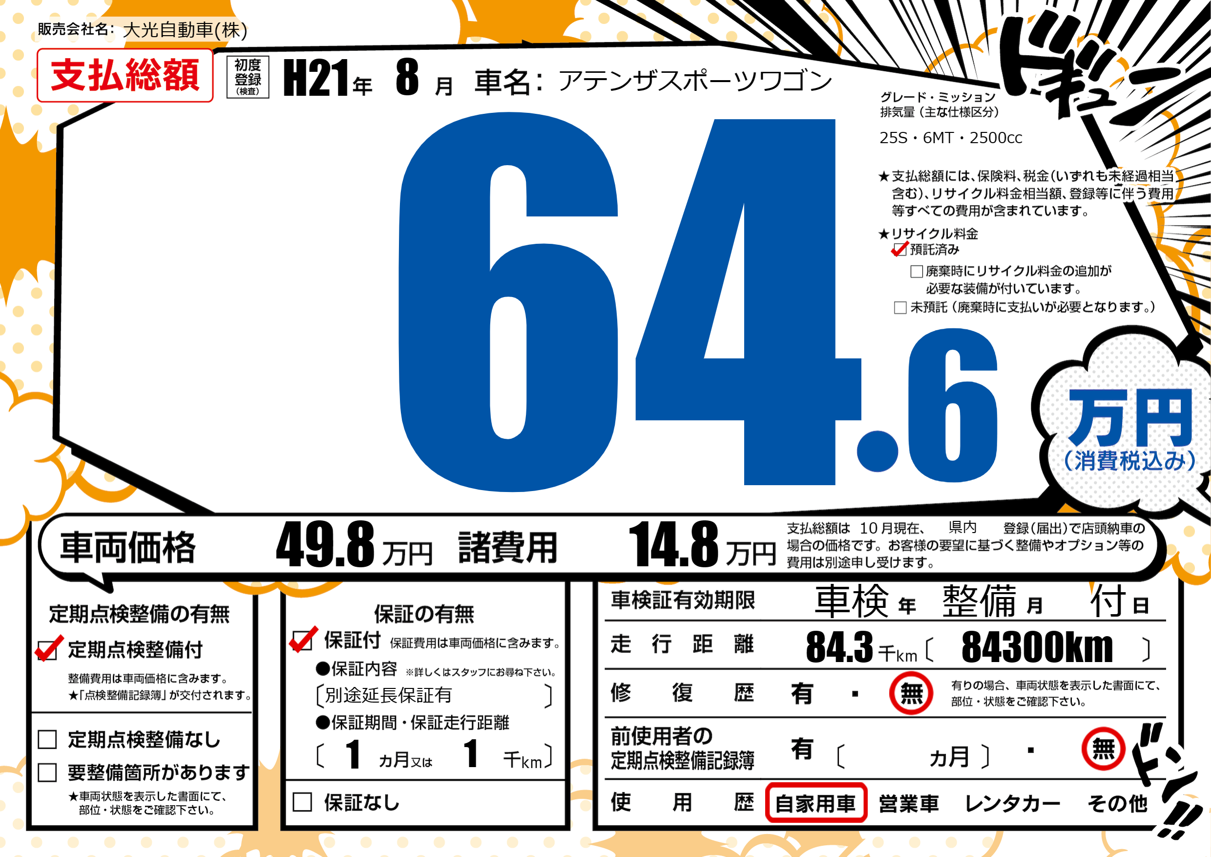 | 走行キロ | 8.4万km | 初年度登録 | H21年8月 |
