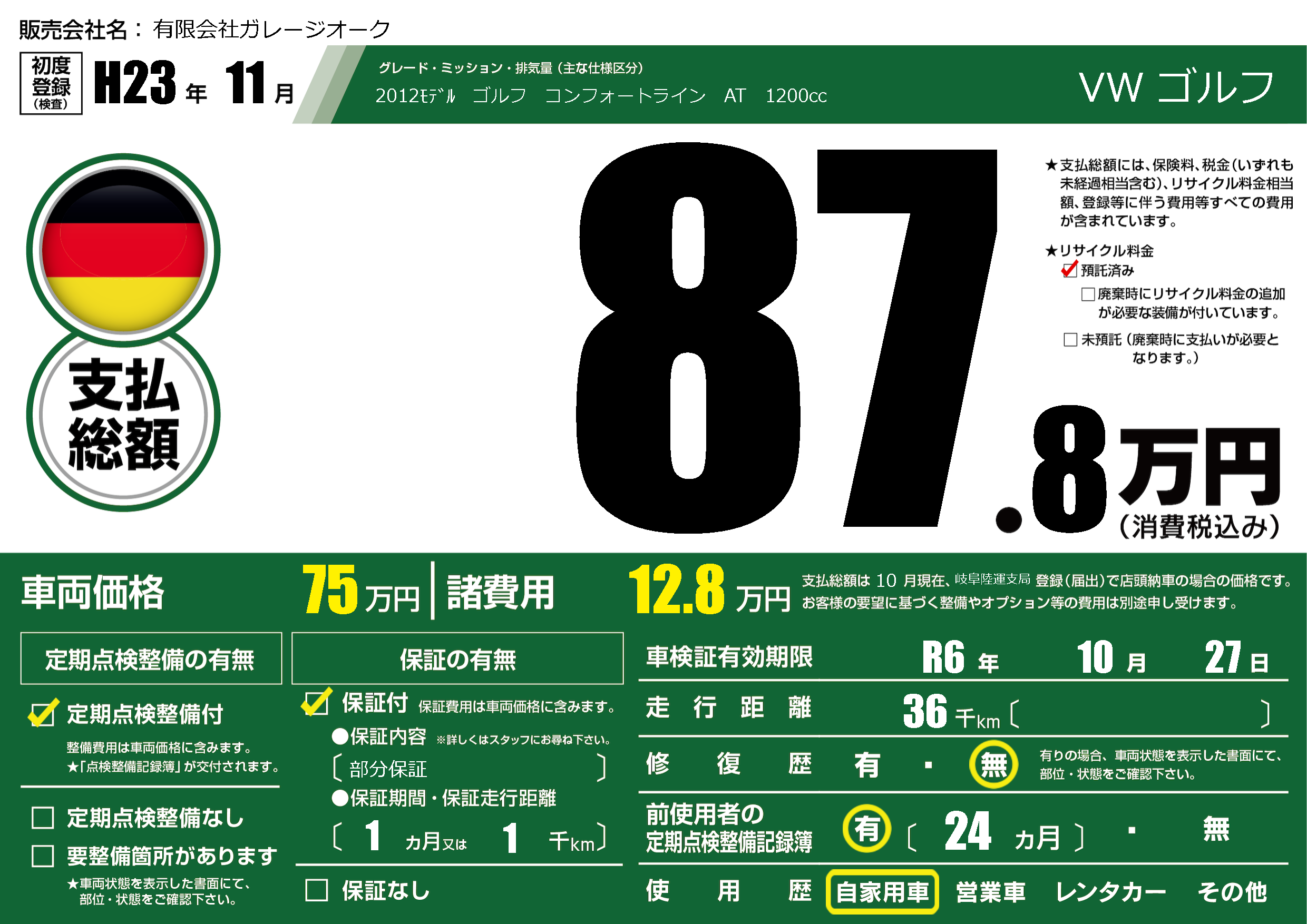 | 車検制限 | R6年 10月 27日 | ||