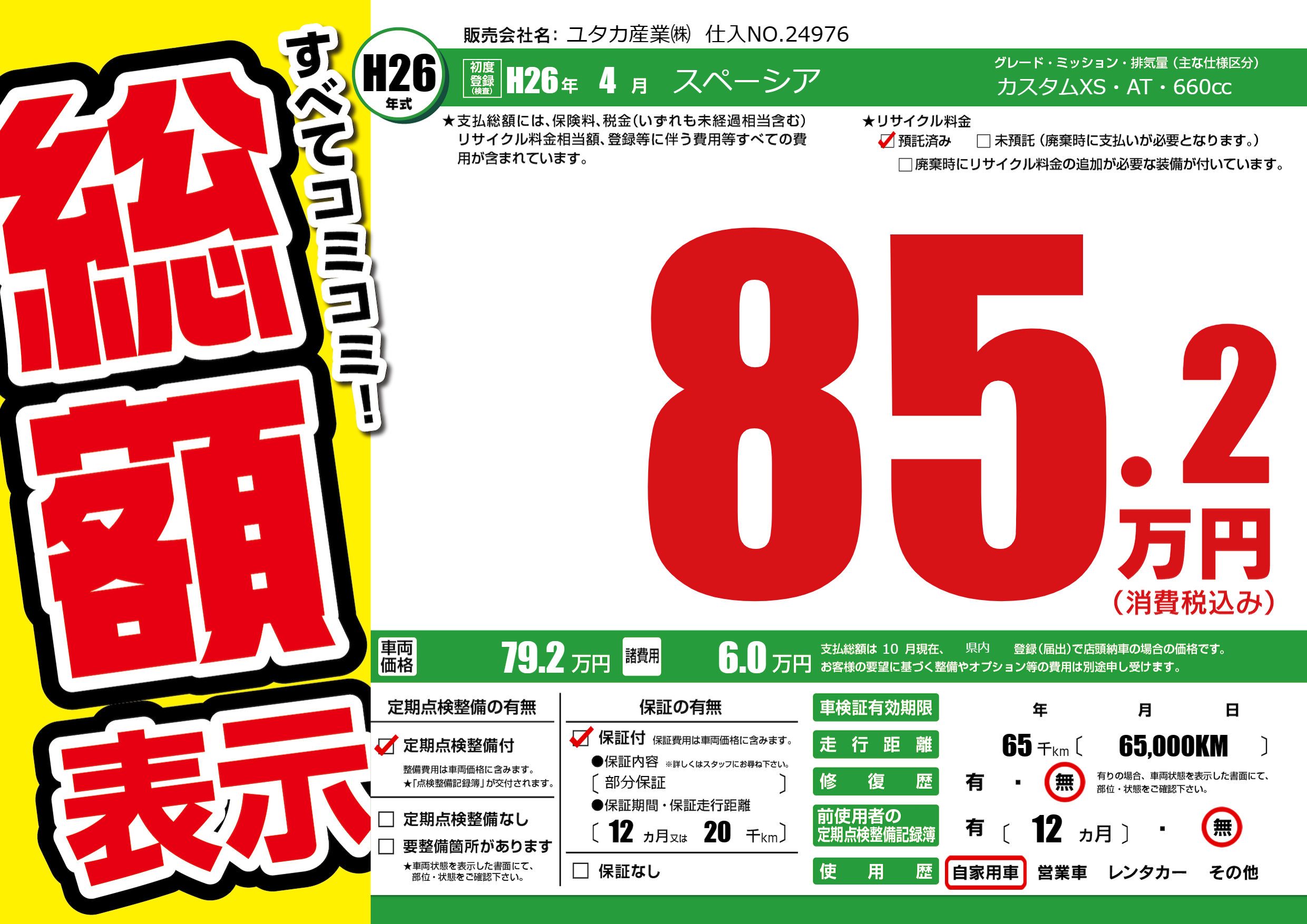 | 走行キロ | 6.5万km | 初年度登録 | H26年4月 |