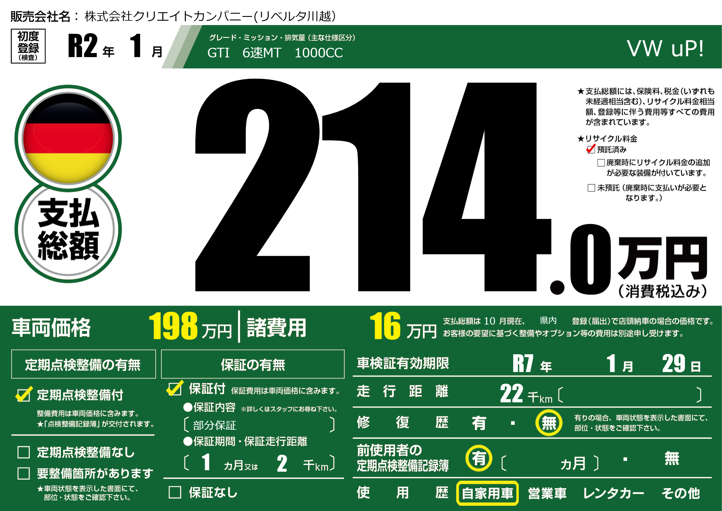 | 車名 | VW uP! | グレード ミッション 排気量 |