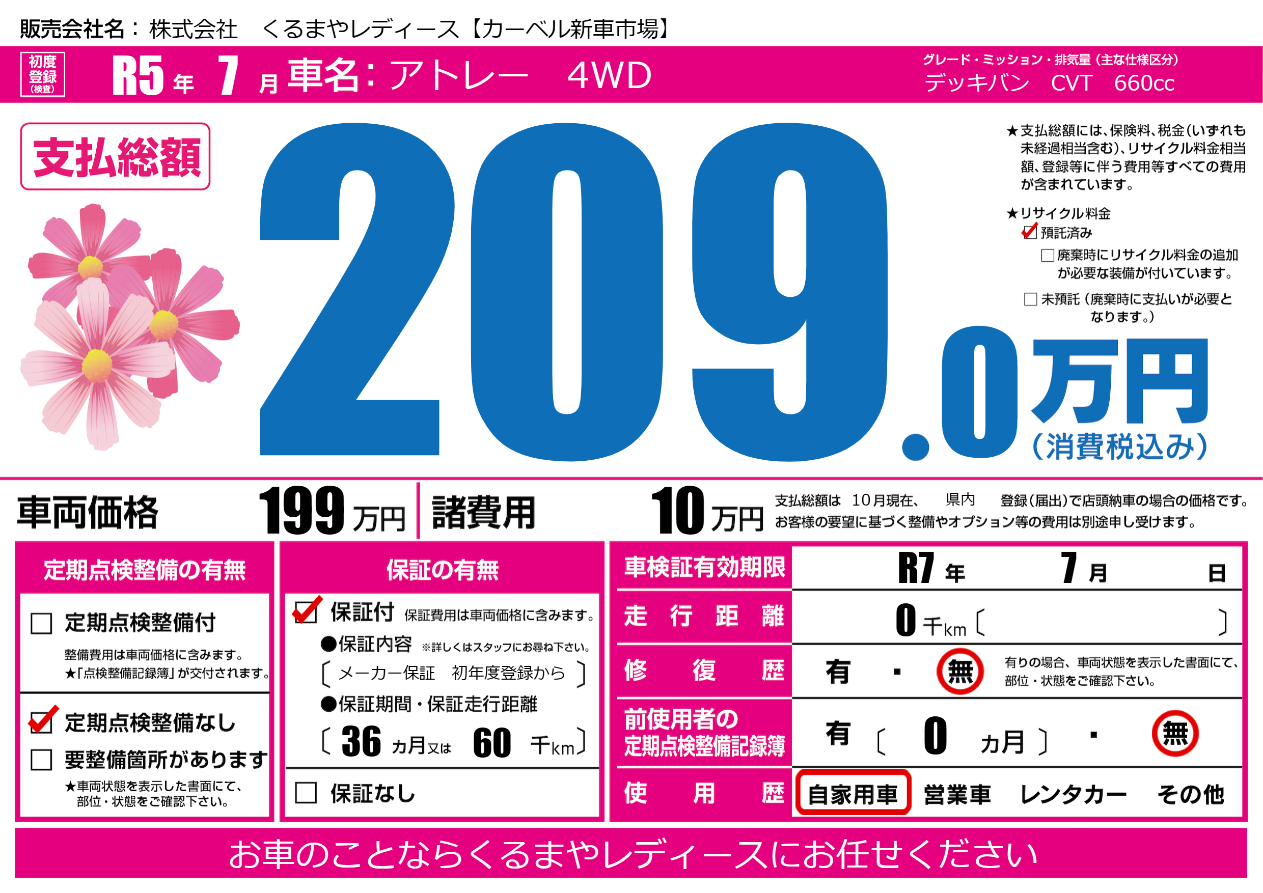 | 車名 | アトレー 4WD | グレード ミッション 排気量 |