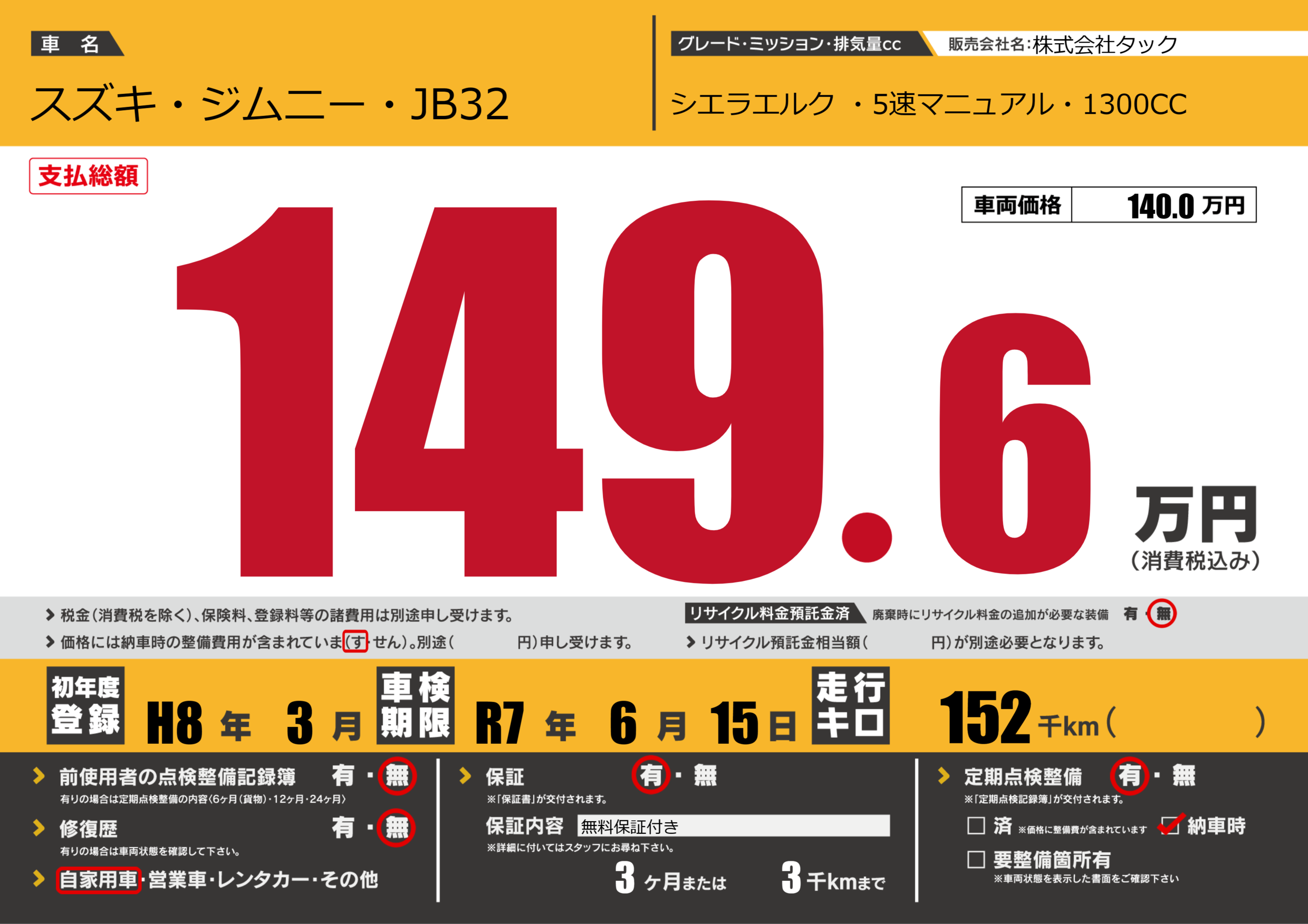| 走行キロ | 15.2万km | 初年度登録 | H8年3月 |