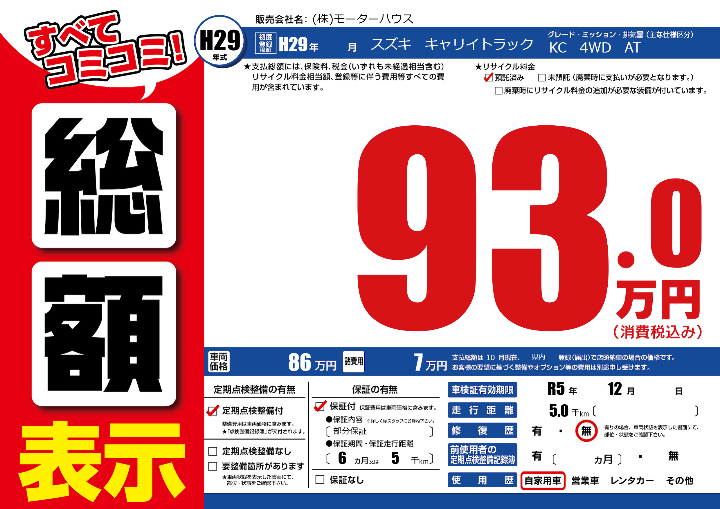 | 車検制限 | R5年 12月 - 日 | ||