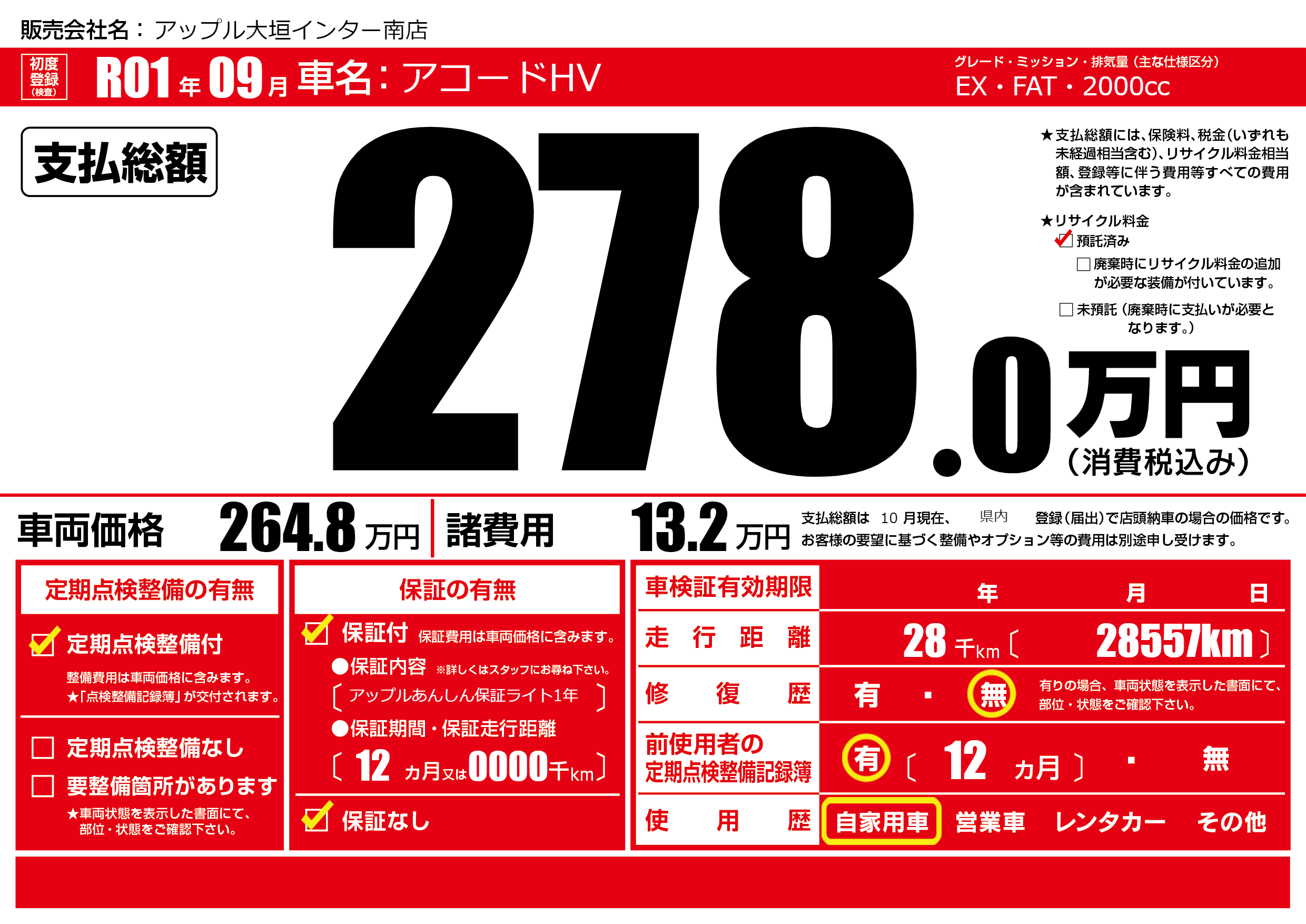 | 車名 | アコードHV | グレード ミッション 排気量 |