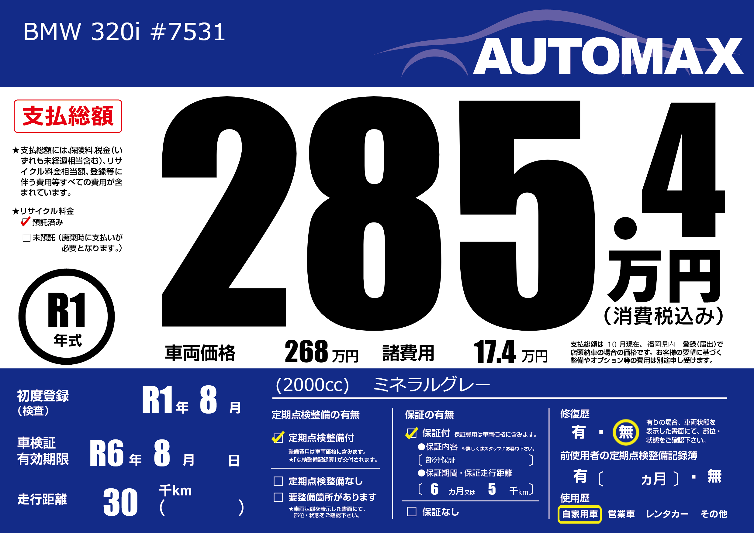 | 車名 | BMW 320i #7531 | グレード ミッション 排気量 |