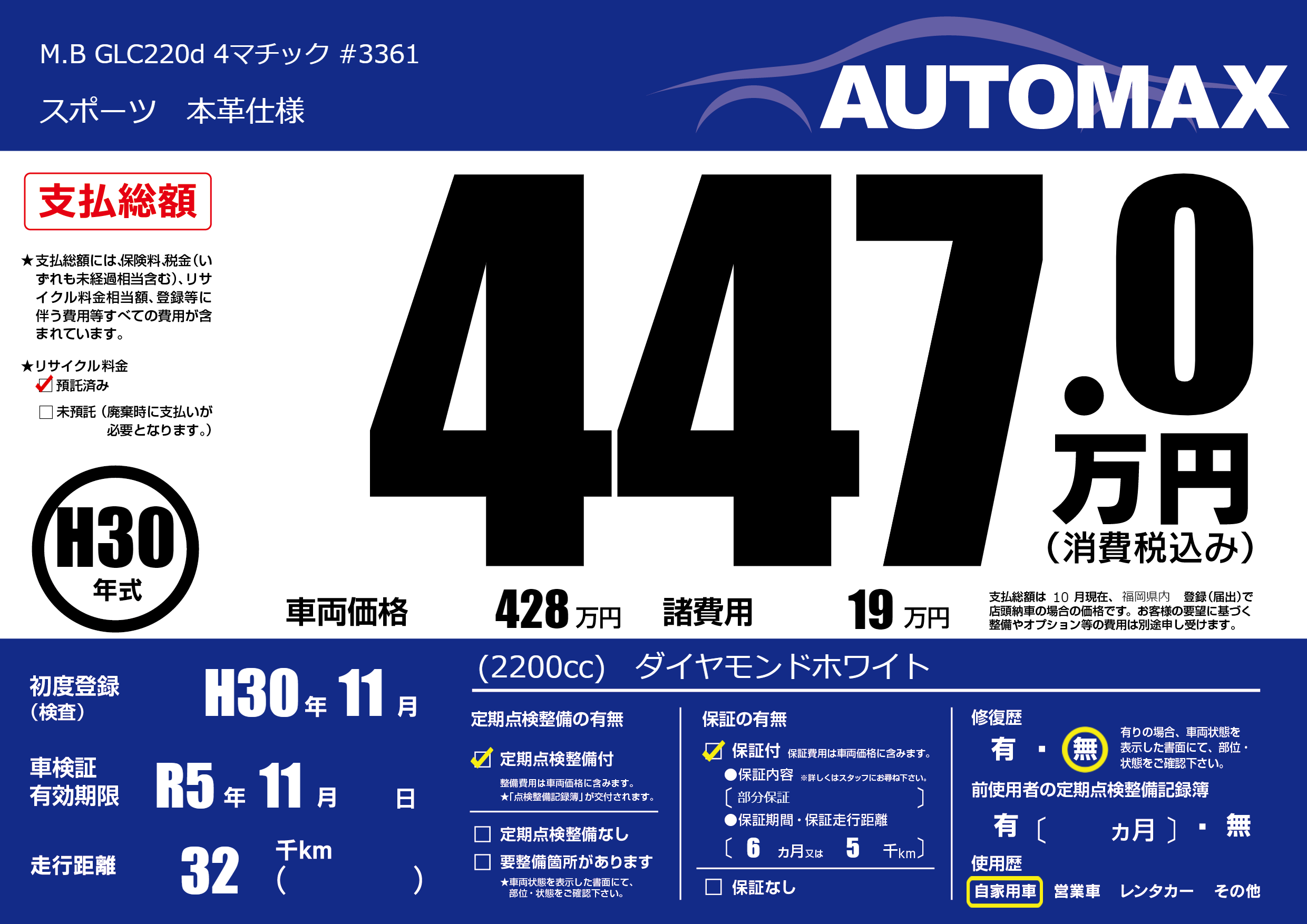 | 車名 | M.B GLC220d 4マチック #3361 | グレード ミッション 排気量 |