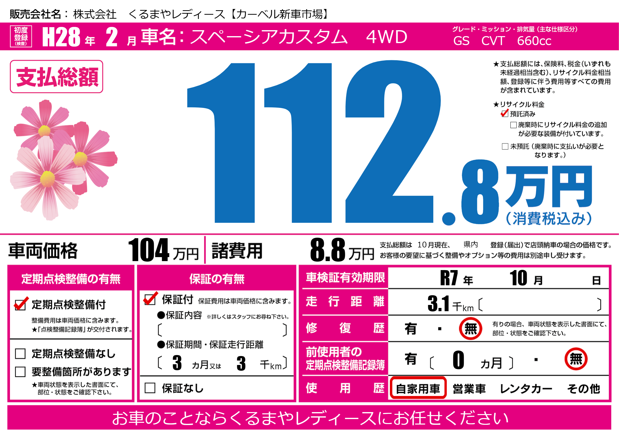 保証付き 保証内容(---) 3ヶ月または(3)千kmまで |