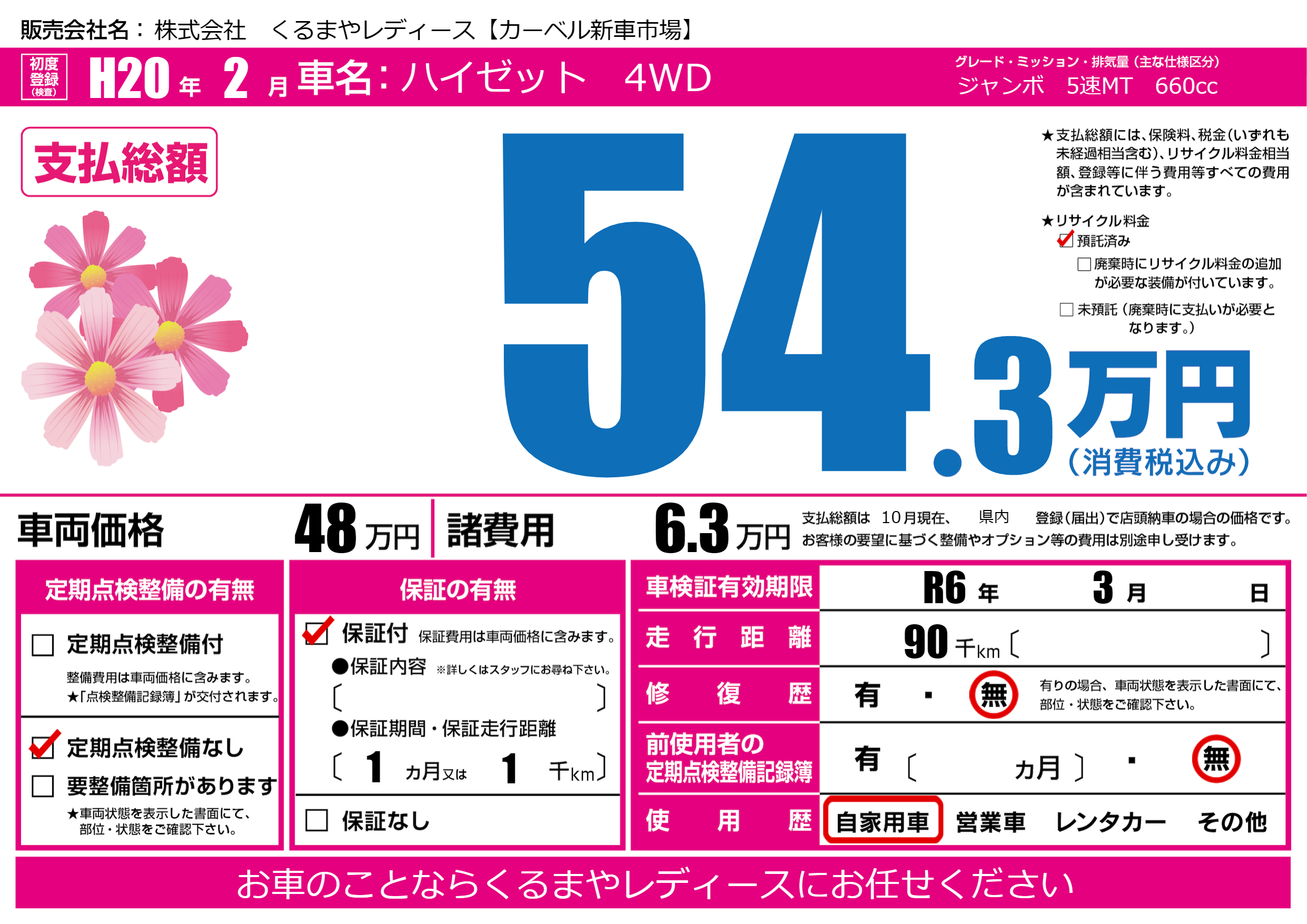 | 車名 | ハイゼット 4WD | グレード ミッション 排気量 |