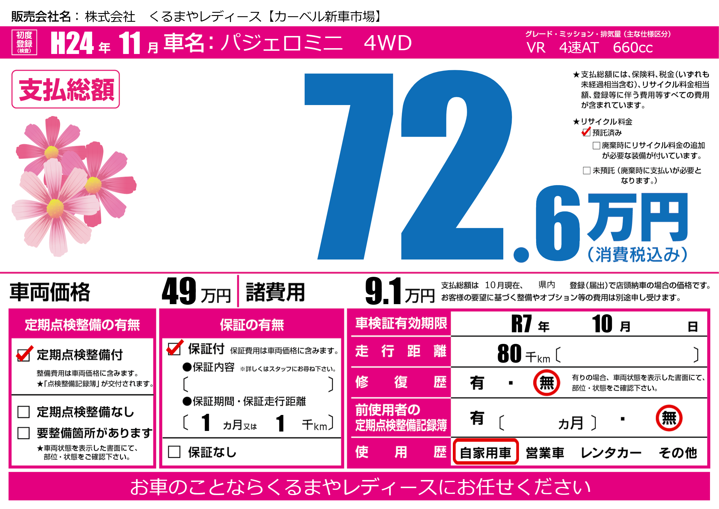 | 車検制限 | R7年 10月 - 日 | ||