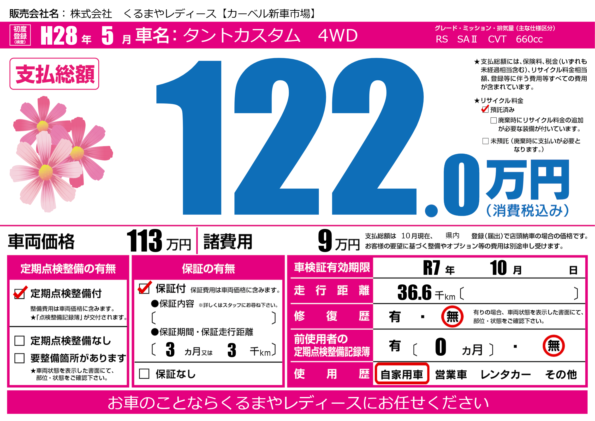 | 車名 | タントカスタム 4WD | グレード ミッション 排気量 |