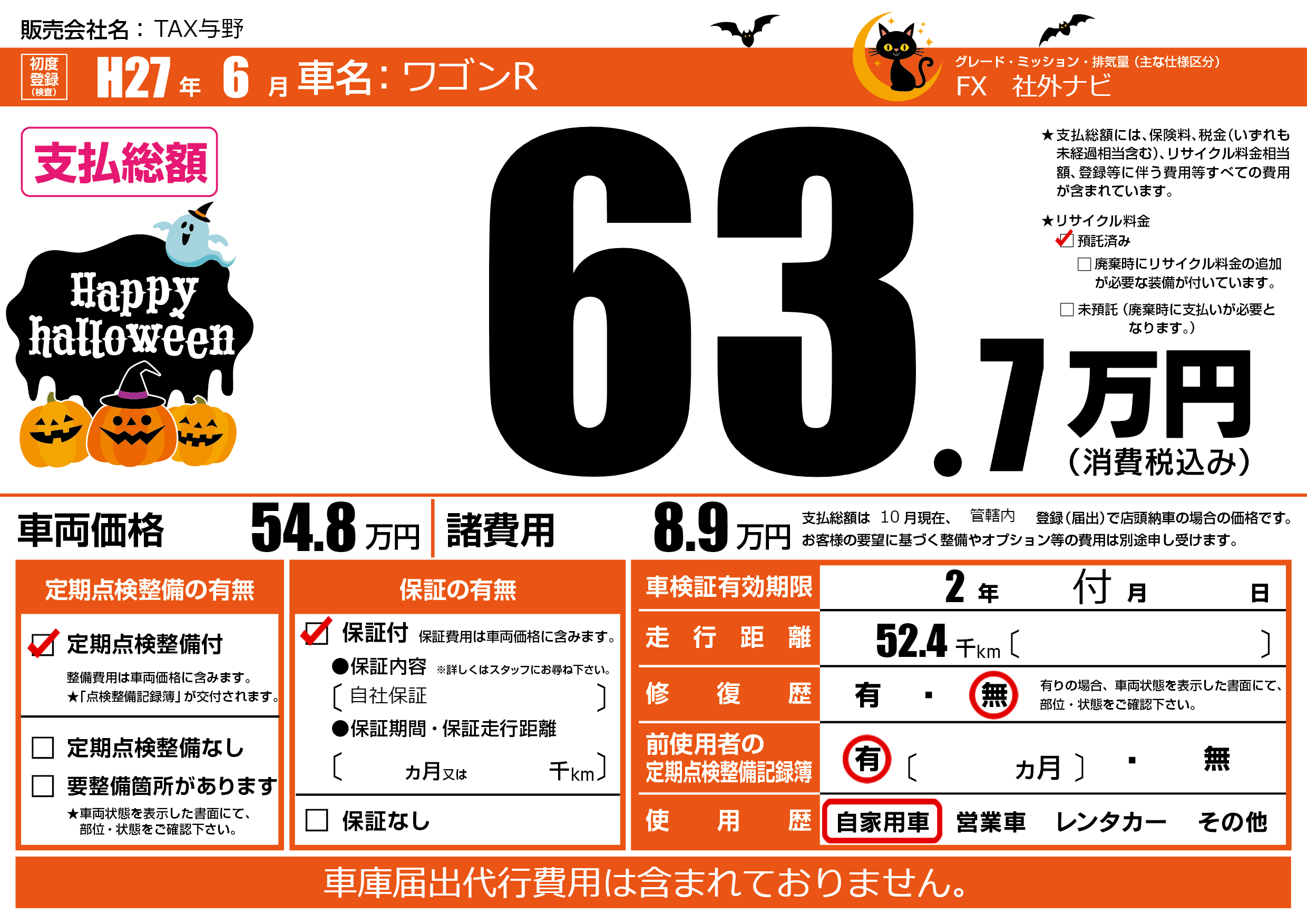 | 走行キロ | 5.2万km | 初年度登録 | H27年6月 |