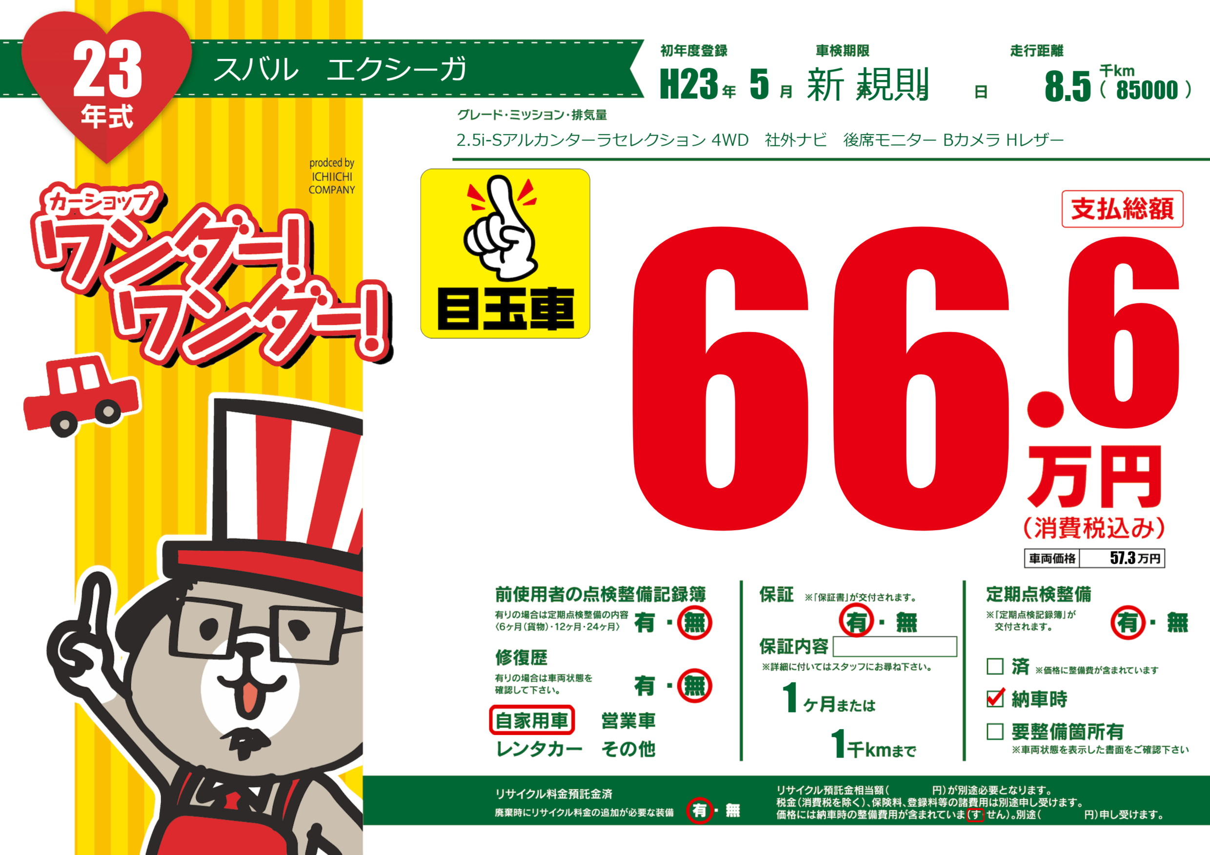 | 走行キロ | 0.8万km | 初年度登録 | H23年5月 |