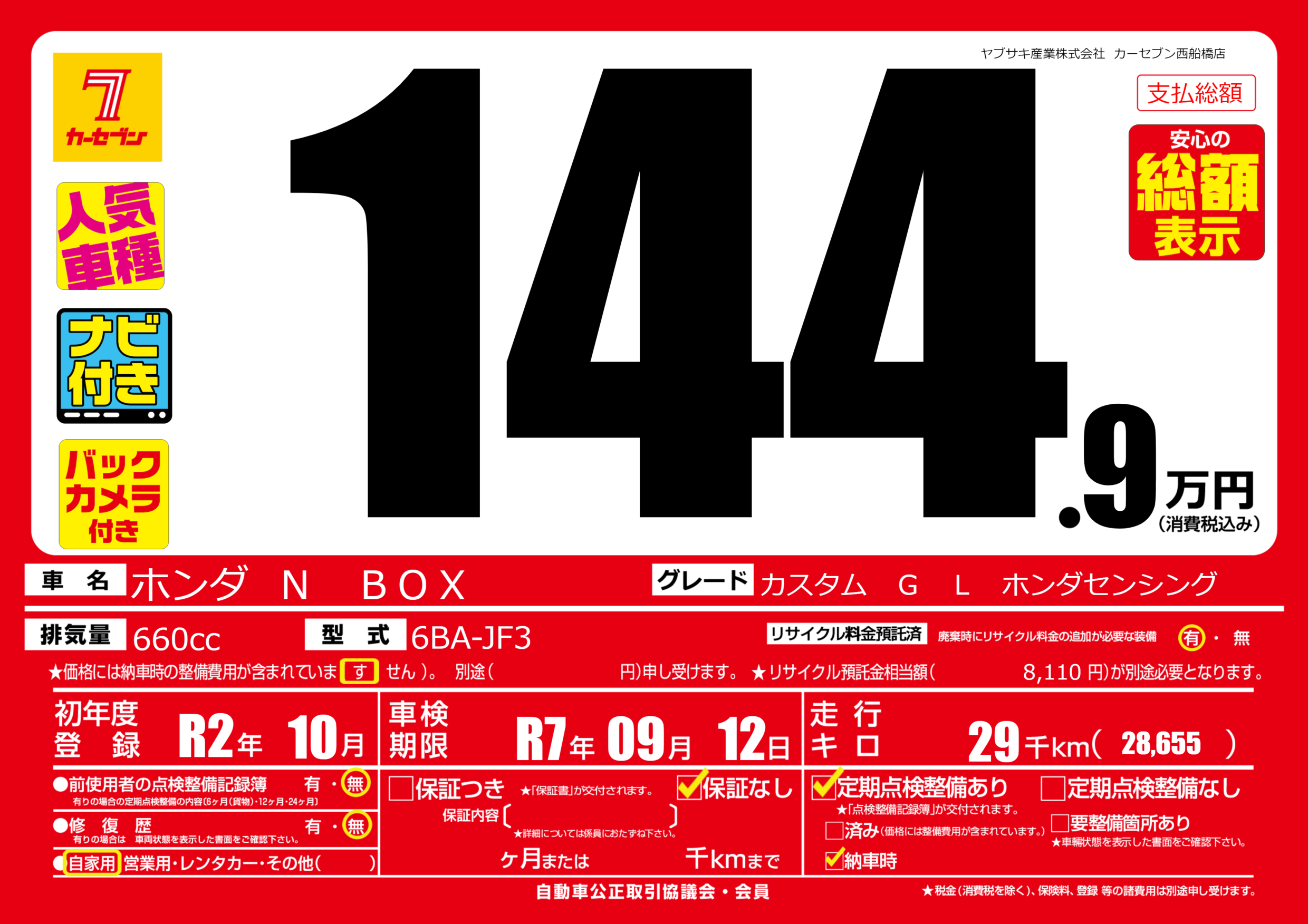 | 車名 | ホンダ N BOX | グレード ミッション 排気量 |