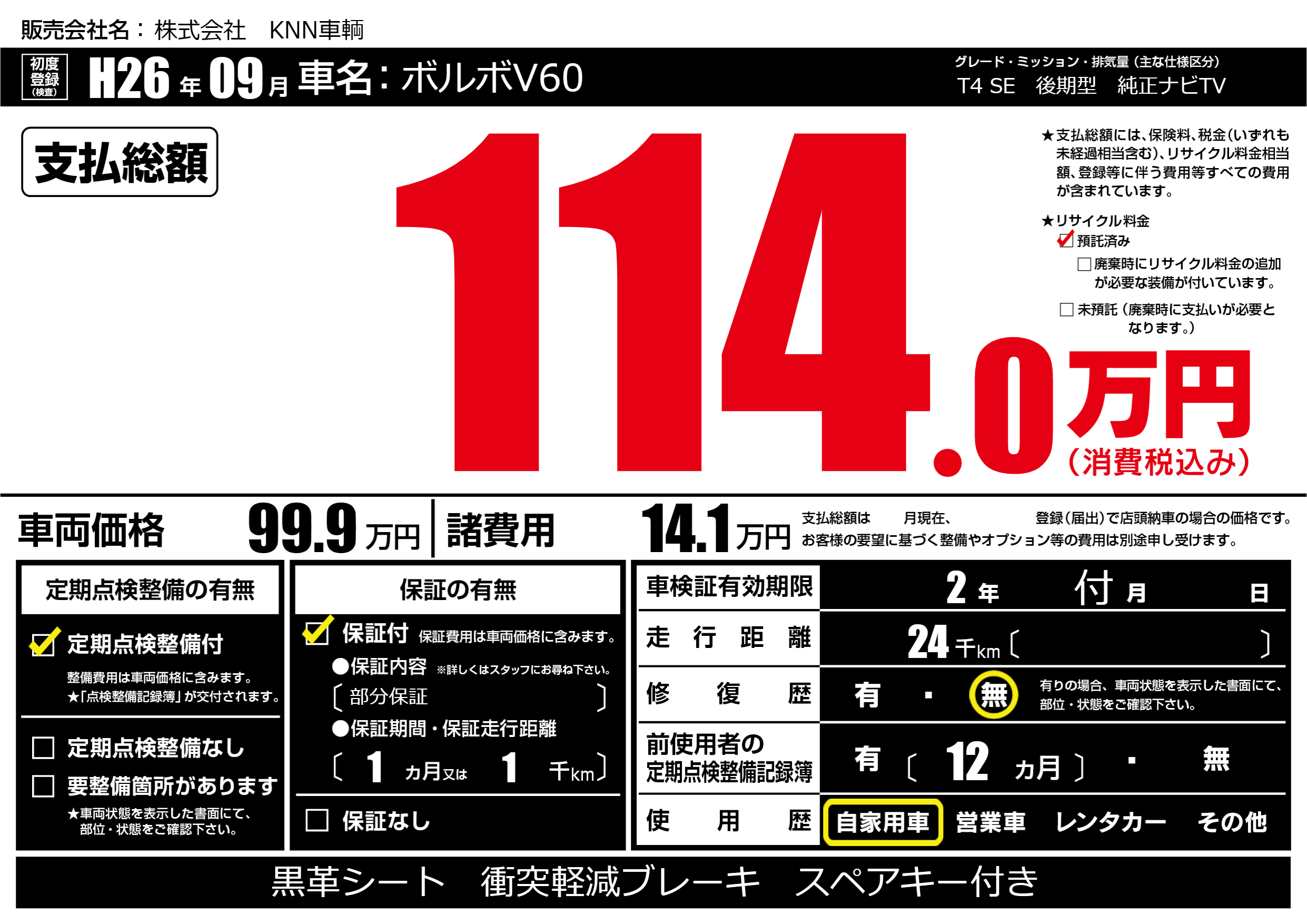 | 走行キロ | 2.4万km | 初年度登録 | H26年09月 |