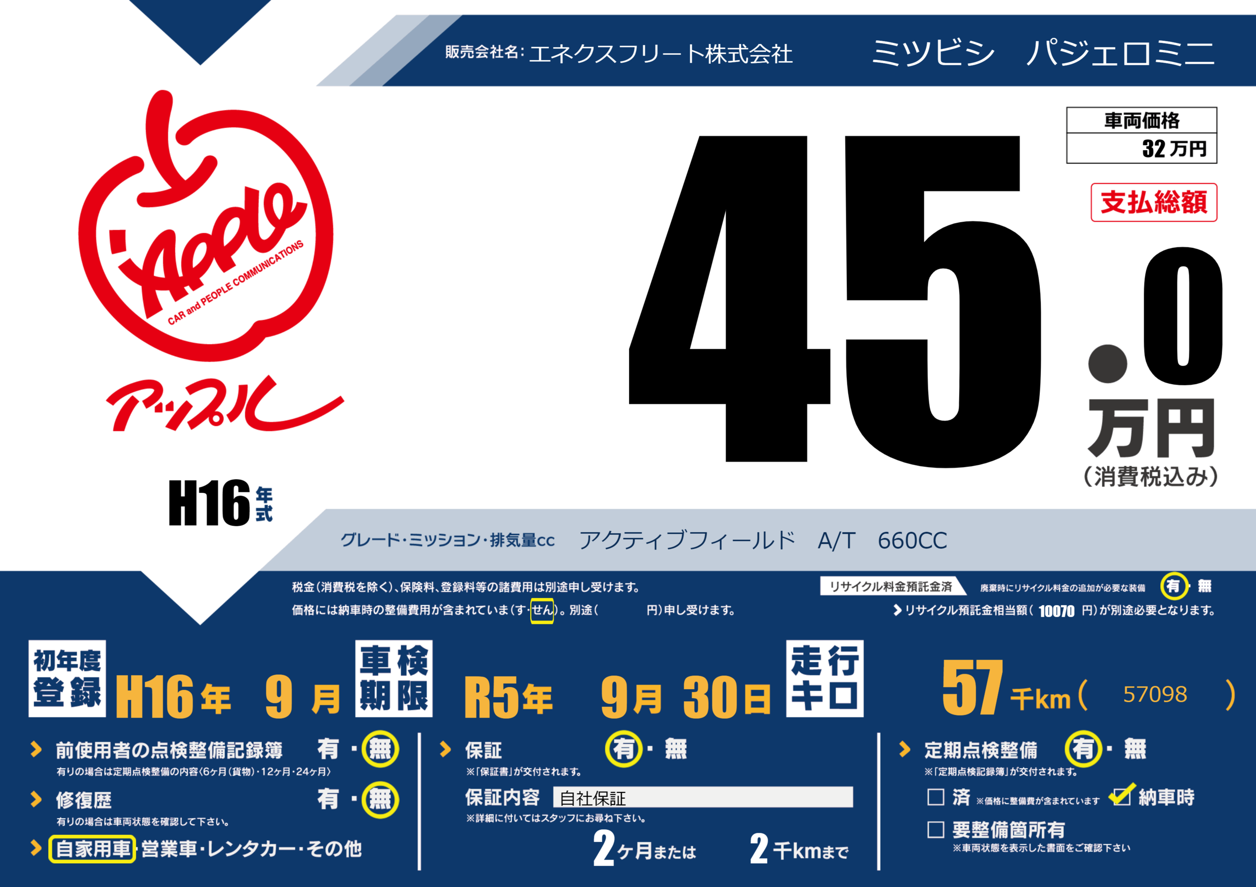 | 車名 | ミツビシ パジェロミニ | グレード ミッション 排気量 |