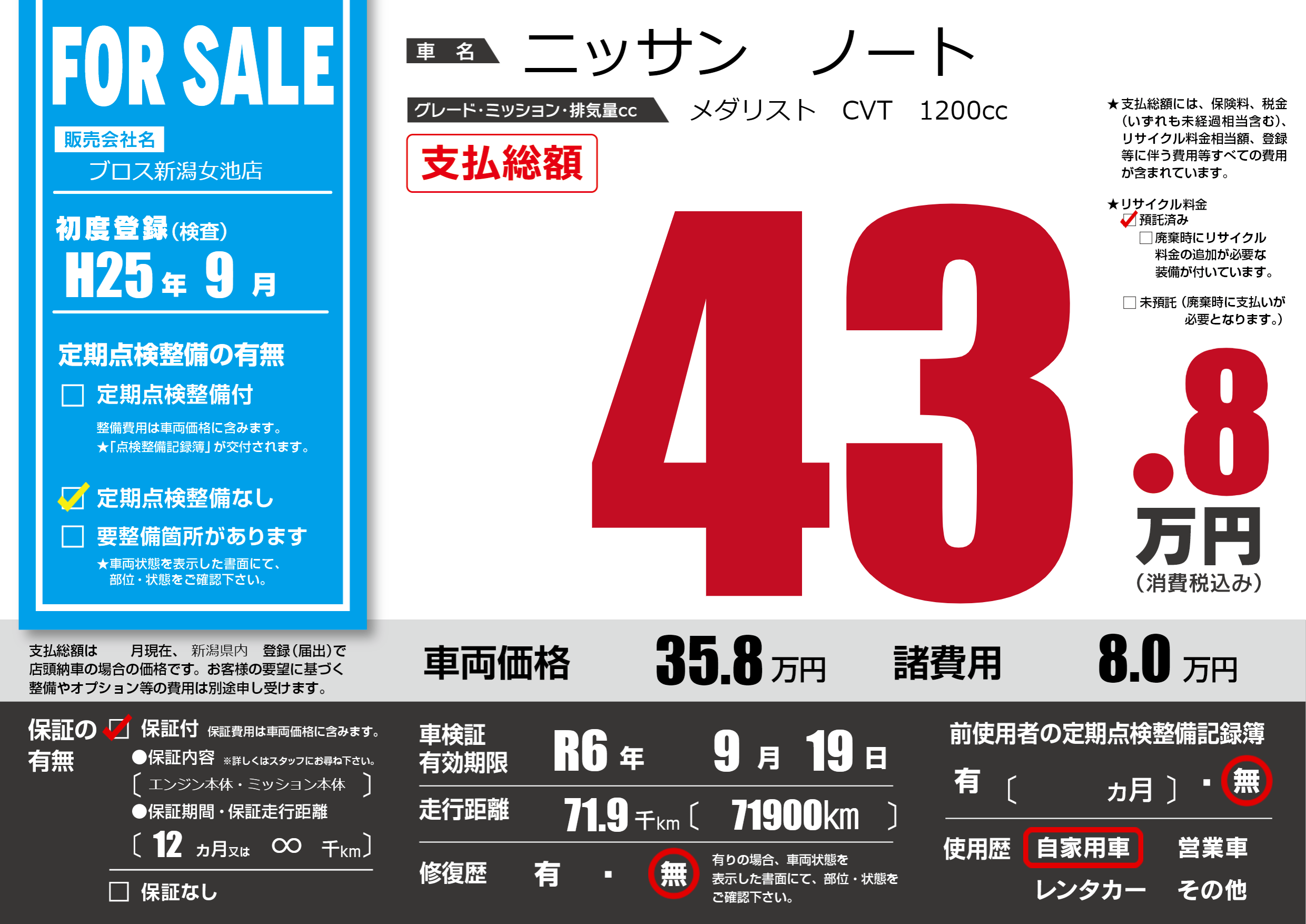 | 車名 | ニッサン ノート | グレード ミッション 排気量 |