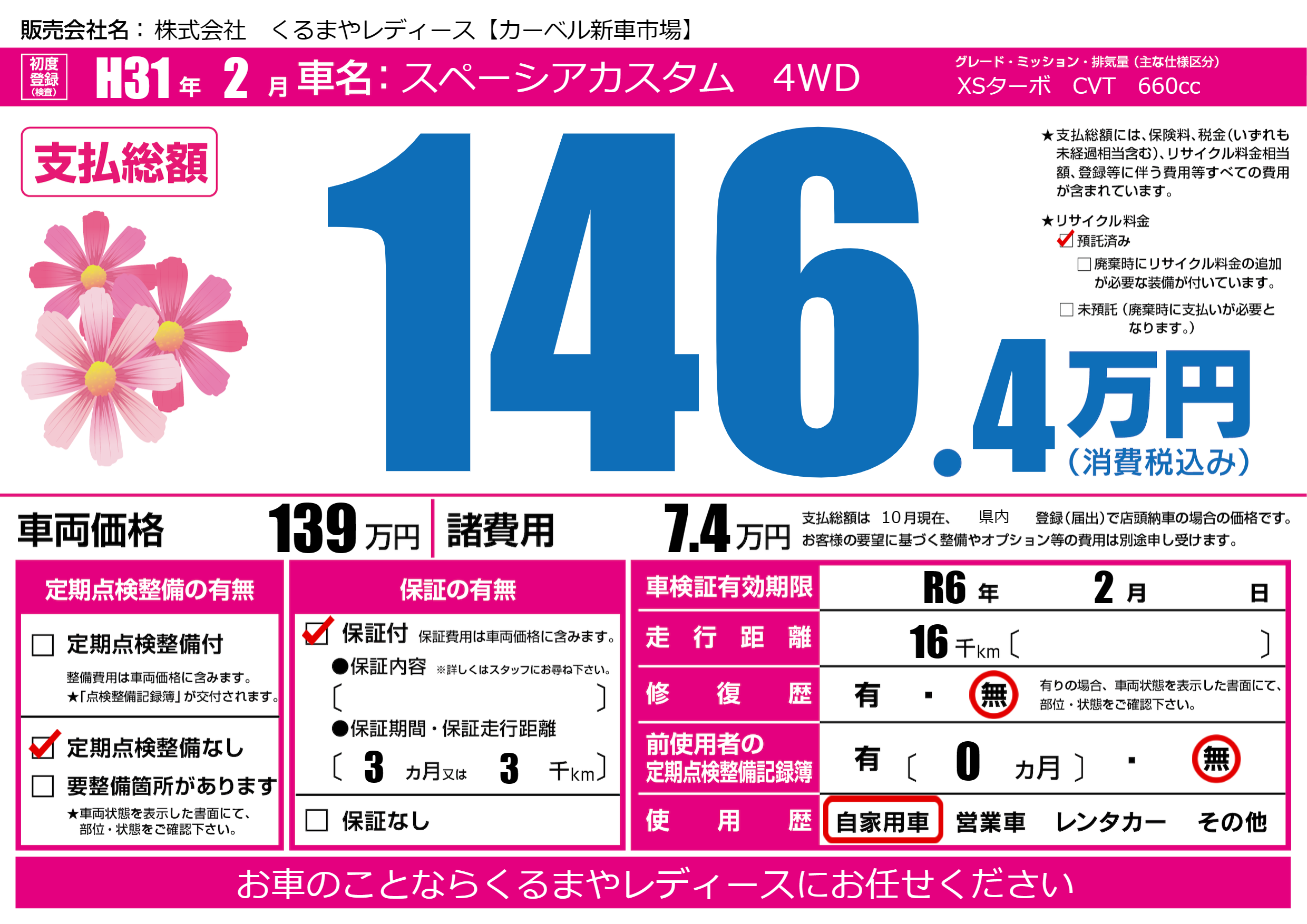 | 車名 | スペーシアカスタム 4WD | グレード ミッション 排気量 |