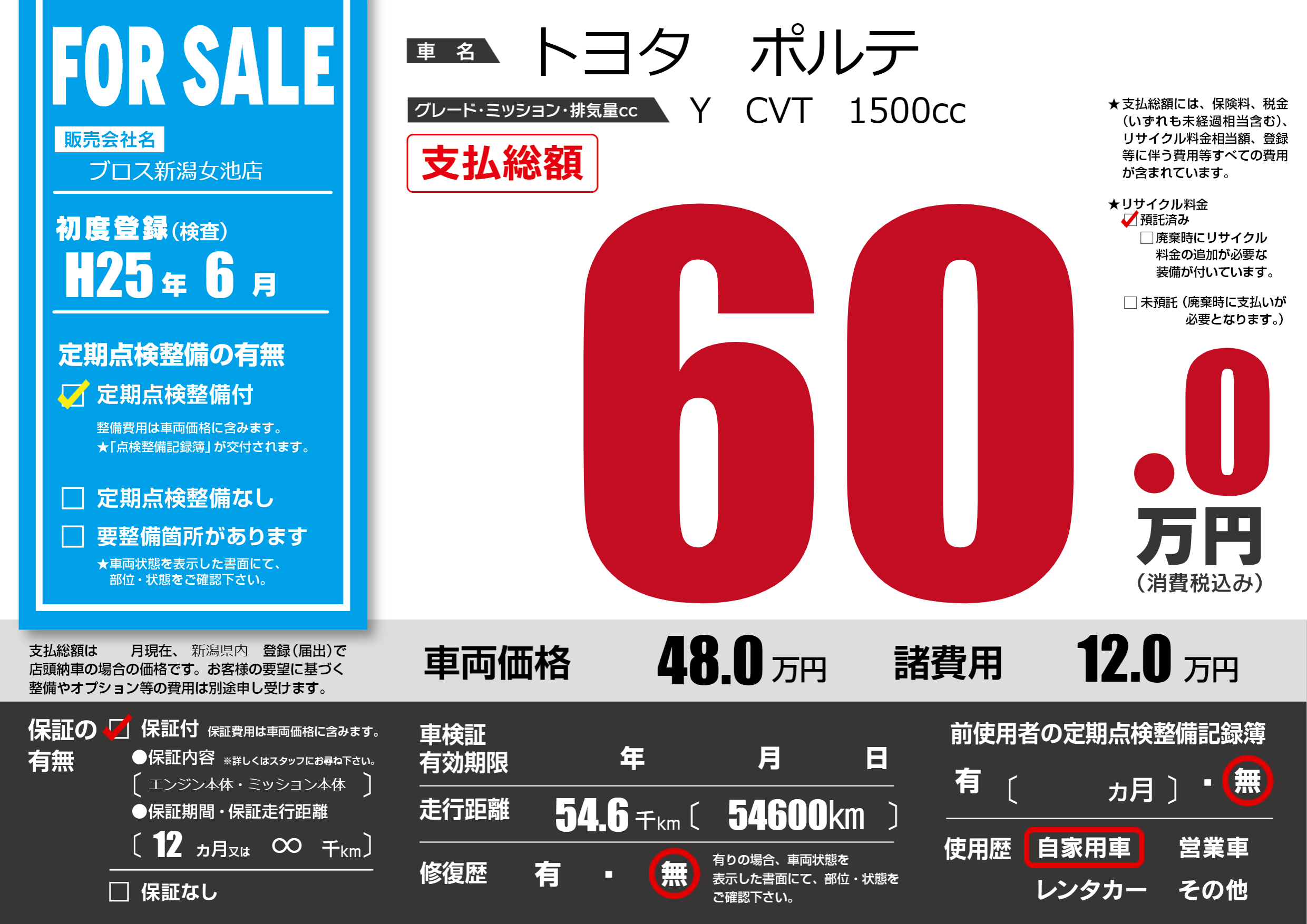 | 車名 | トヨタ ポルテ | グレード ミッション 排気量 |