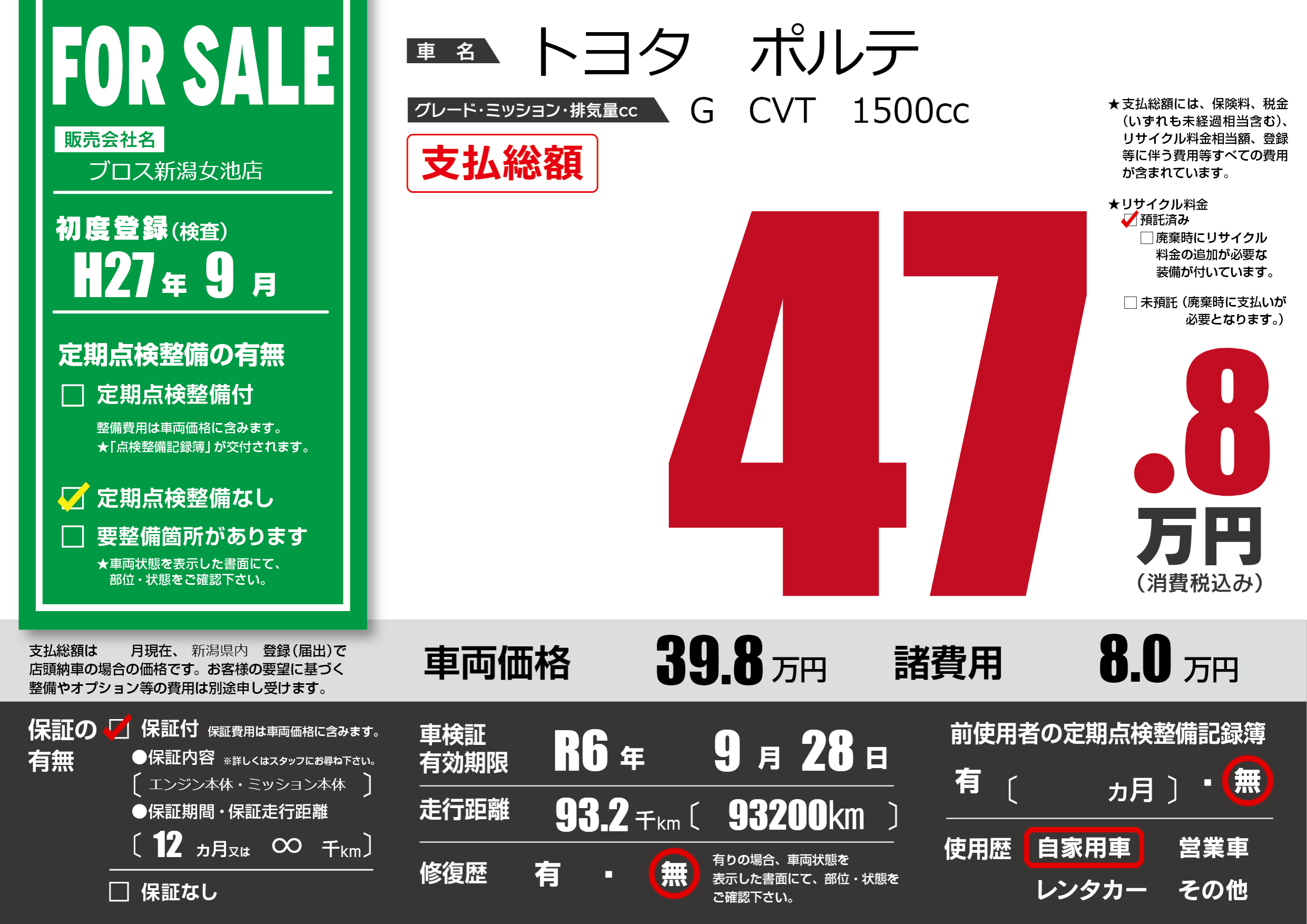 | 車名 | トヨタ ポルテ | グレード ミッション 排気量 |