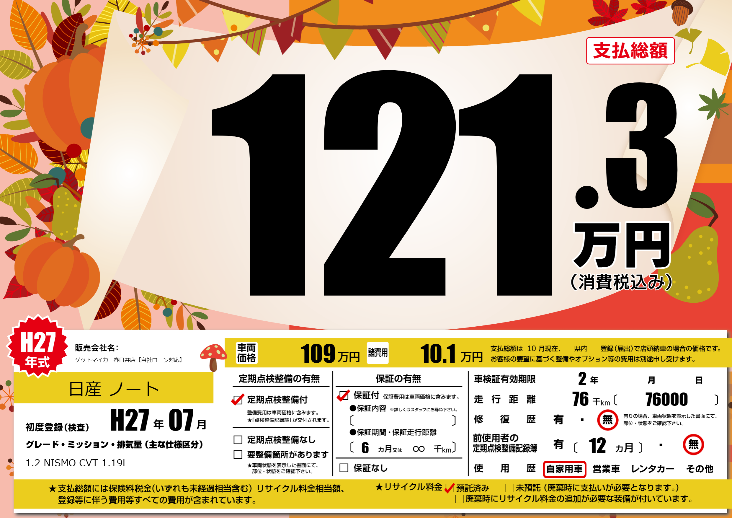 | 走行キロ | 7.6万km | 初年度登録 | H27年07月 |