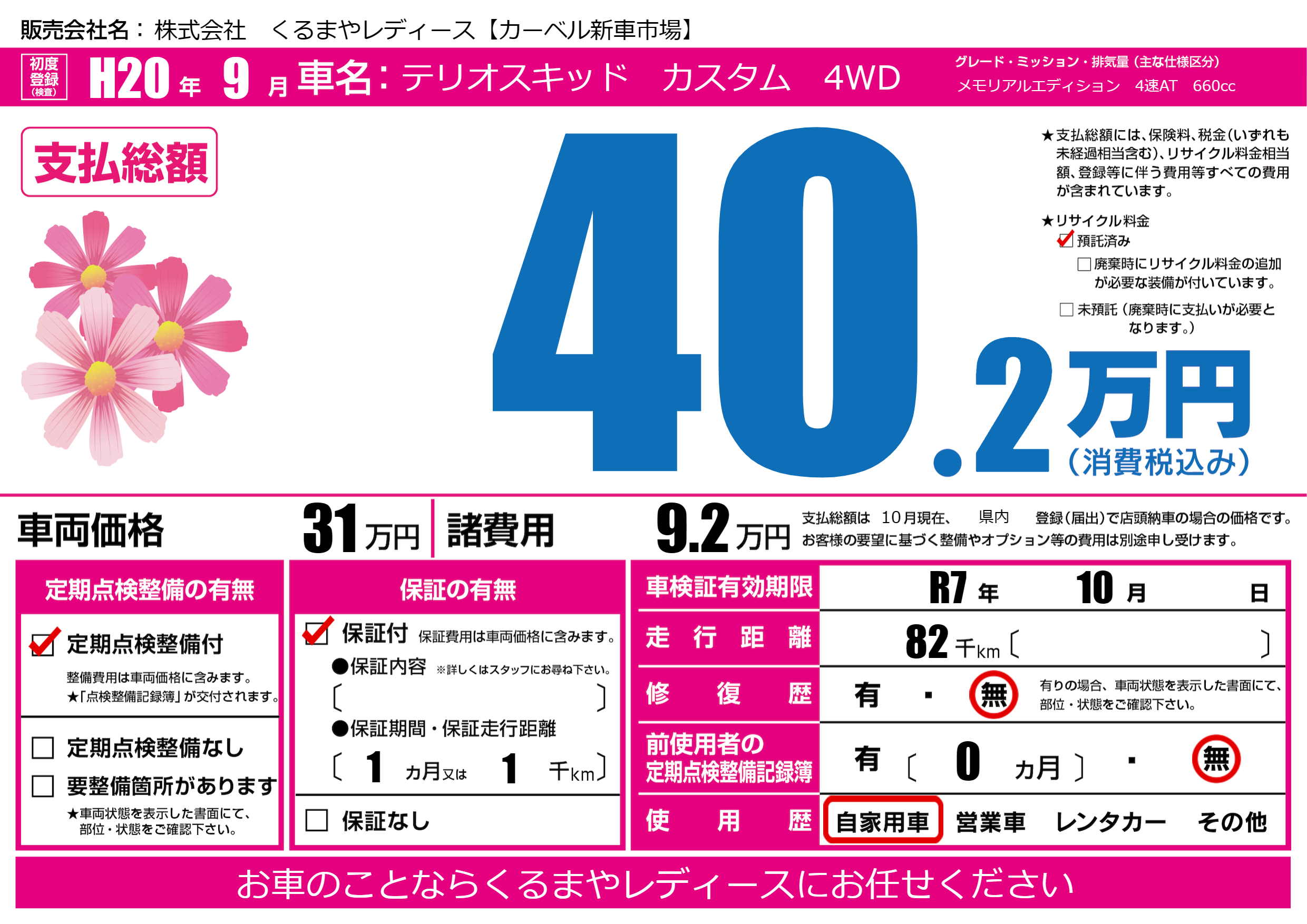 | 車名 | テリオスキッド カスタム 4WD | グレード ミッション 排気量 |