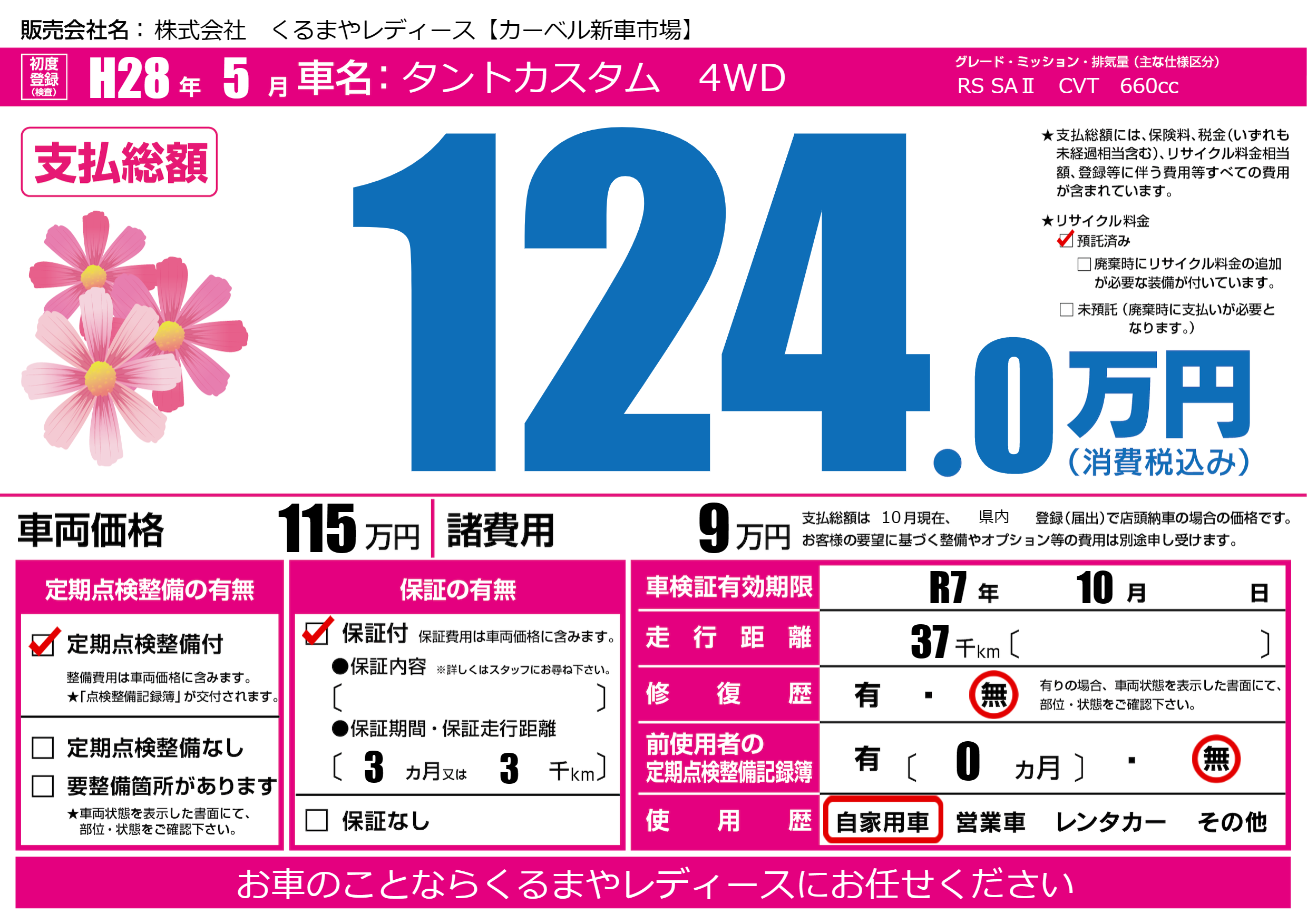 | 車名 | タントカスタム 4WD | グレード ミッション 排気量 |