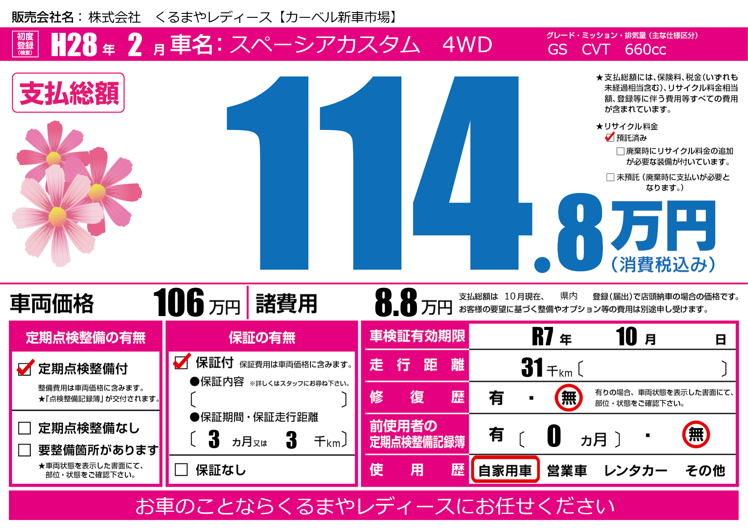 | 車検制限 | R7年 10月 - 日 | ||
