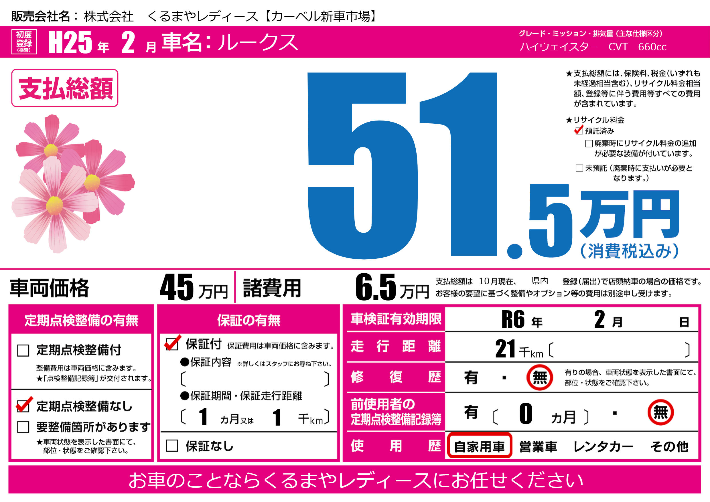 | 走行キロ | 2.1万km | 初年度登録 | H25年2月 |
