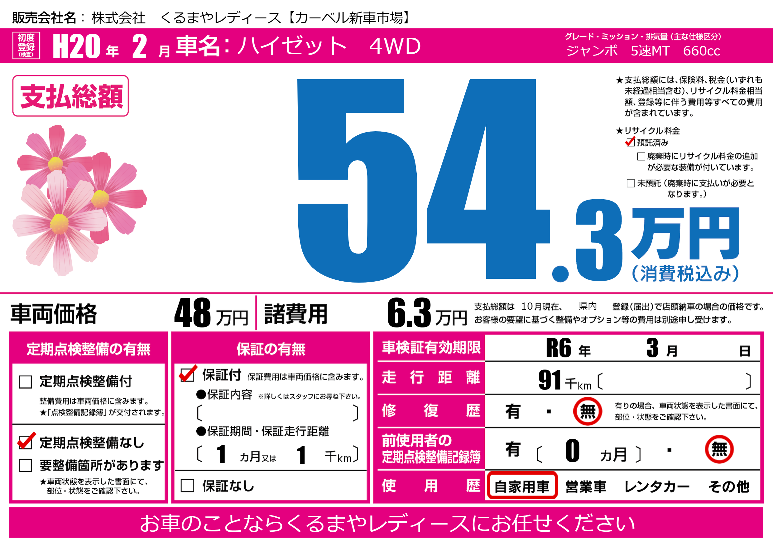 | 走行キロ | 9.1万km | 初年度登録 | H20年2月 |