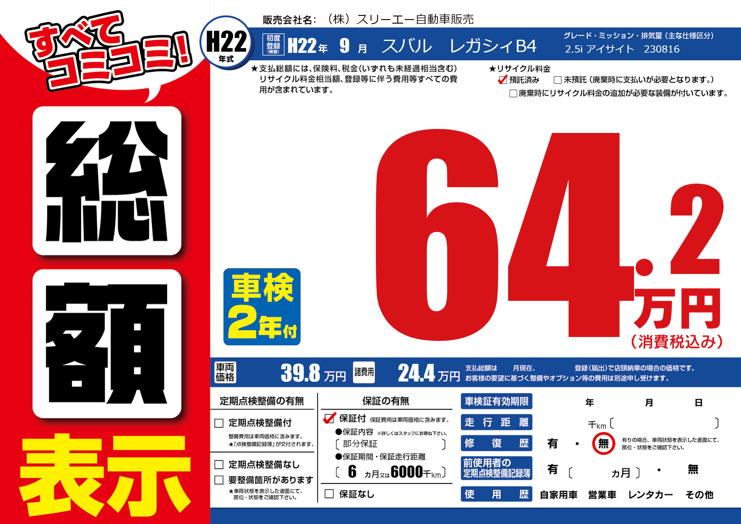 | 車名 | スバル レガシィB4 | グレード ミッション 排気量 |