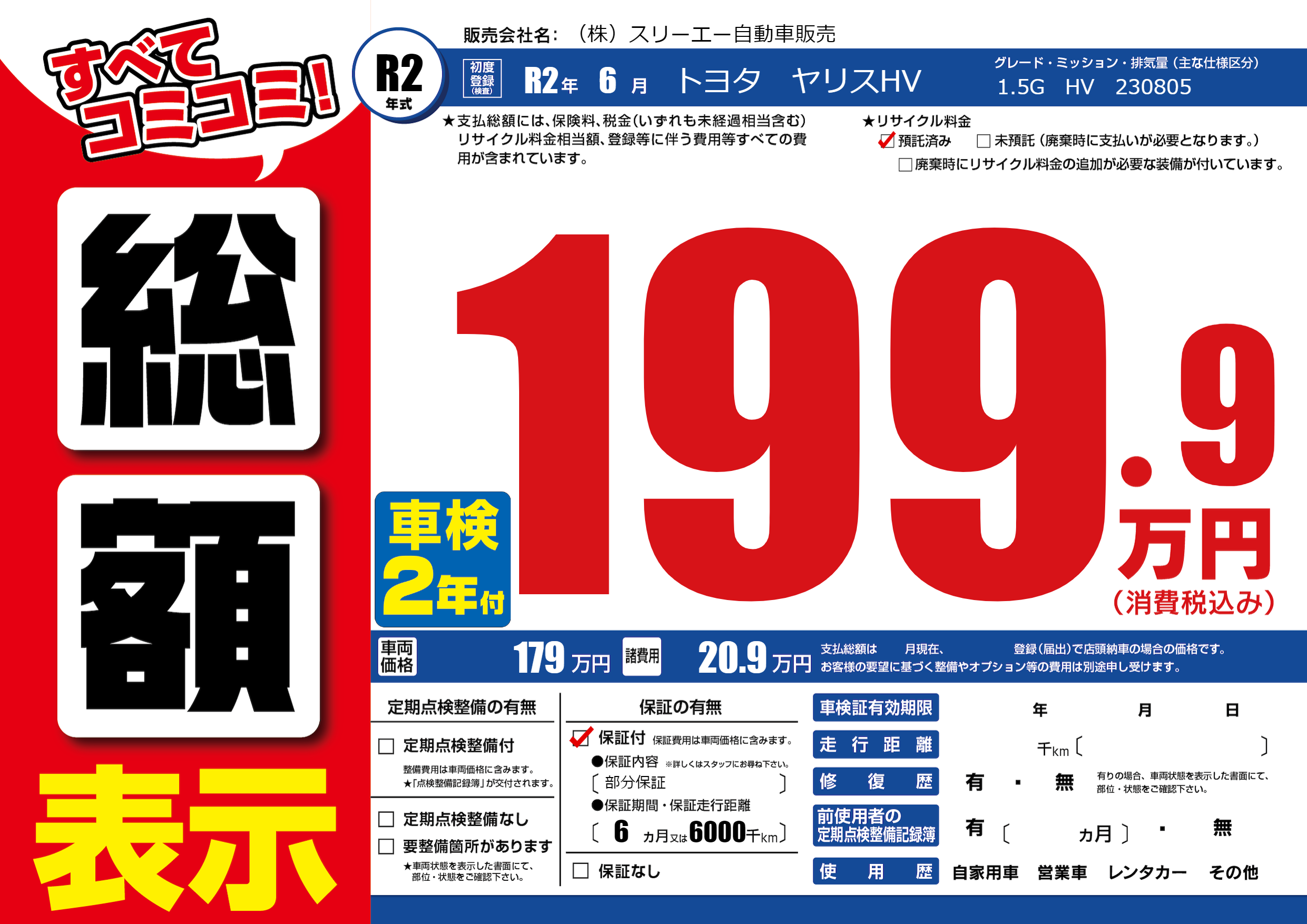 保証付き 保証内容(部分保証) 6ヶ月または(6000)千kmまで |