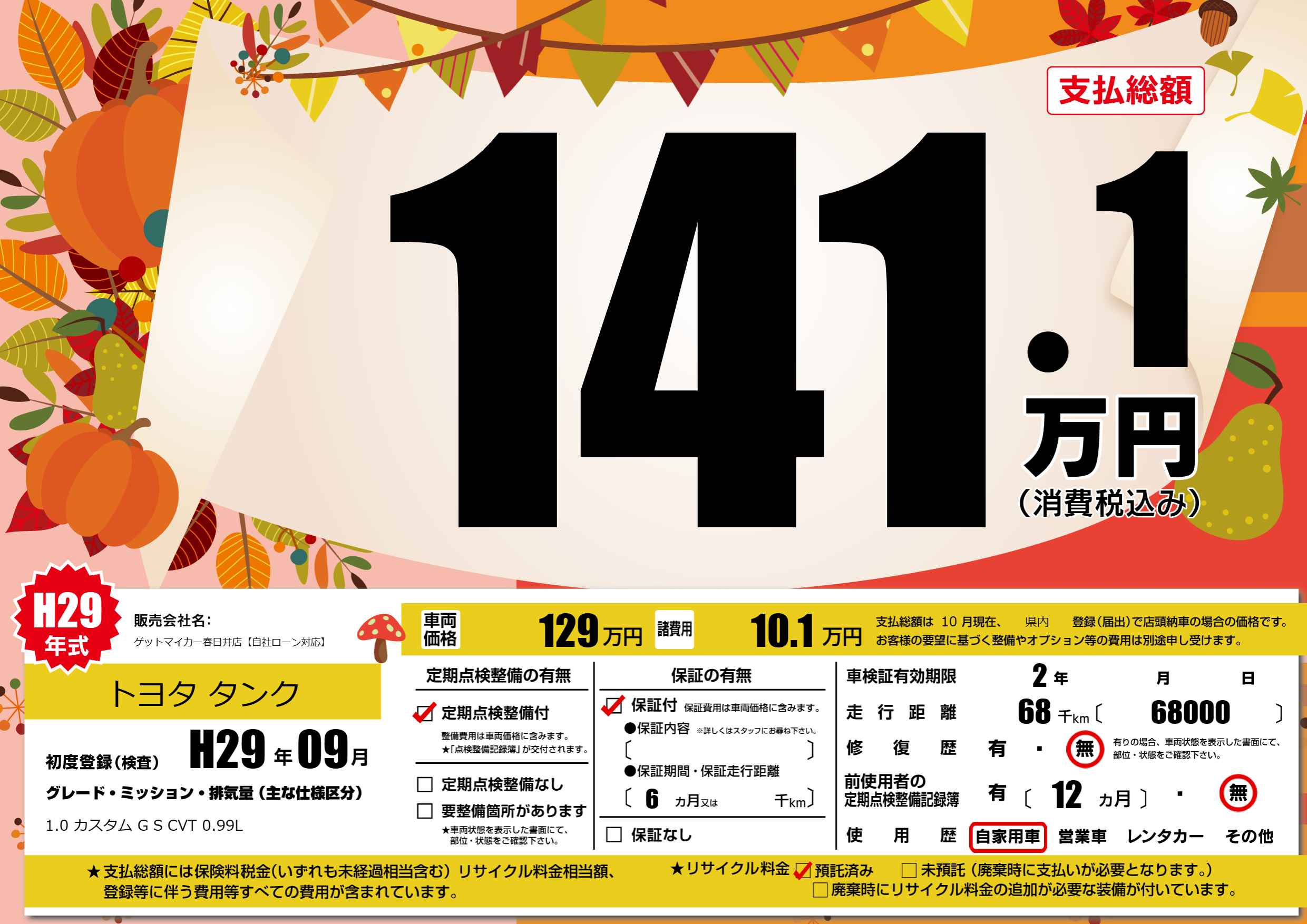 | 車名 | トヨタ タンク | グレード ミッション 排気量 |