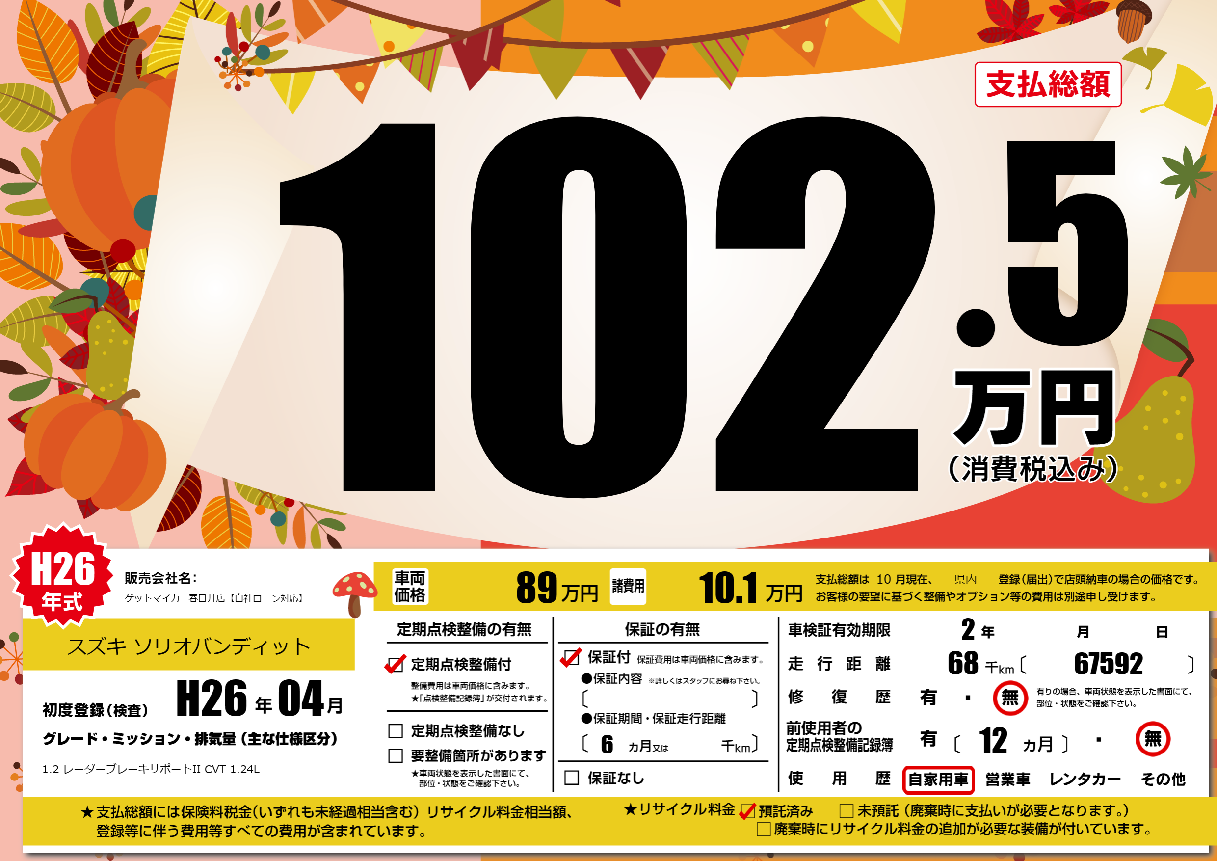 | 車名 | スズキ ソリオバンディット | グレード ミッション 排気量 |