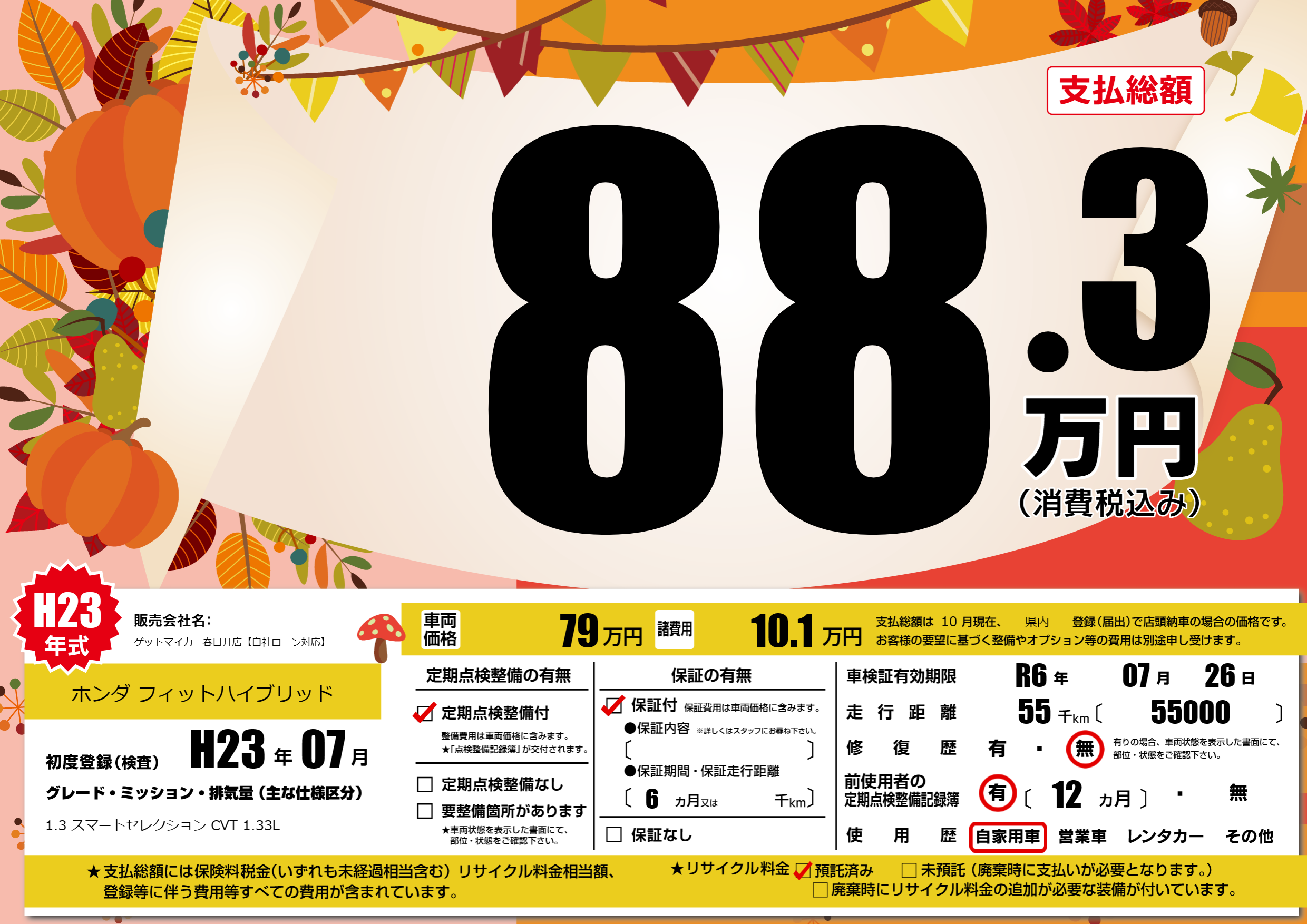 | 走行キロ | 5.5万km | 初年度登録 | H23年07月 |