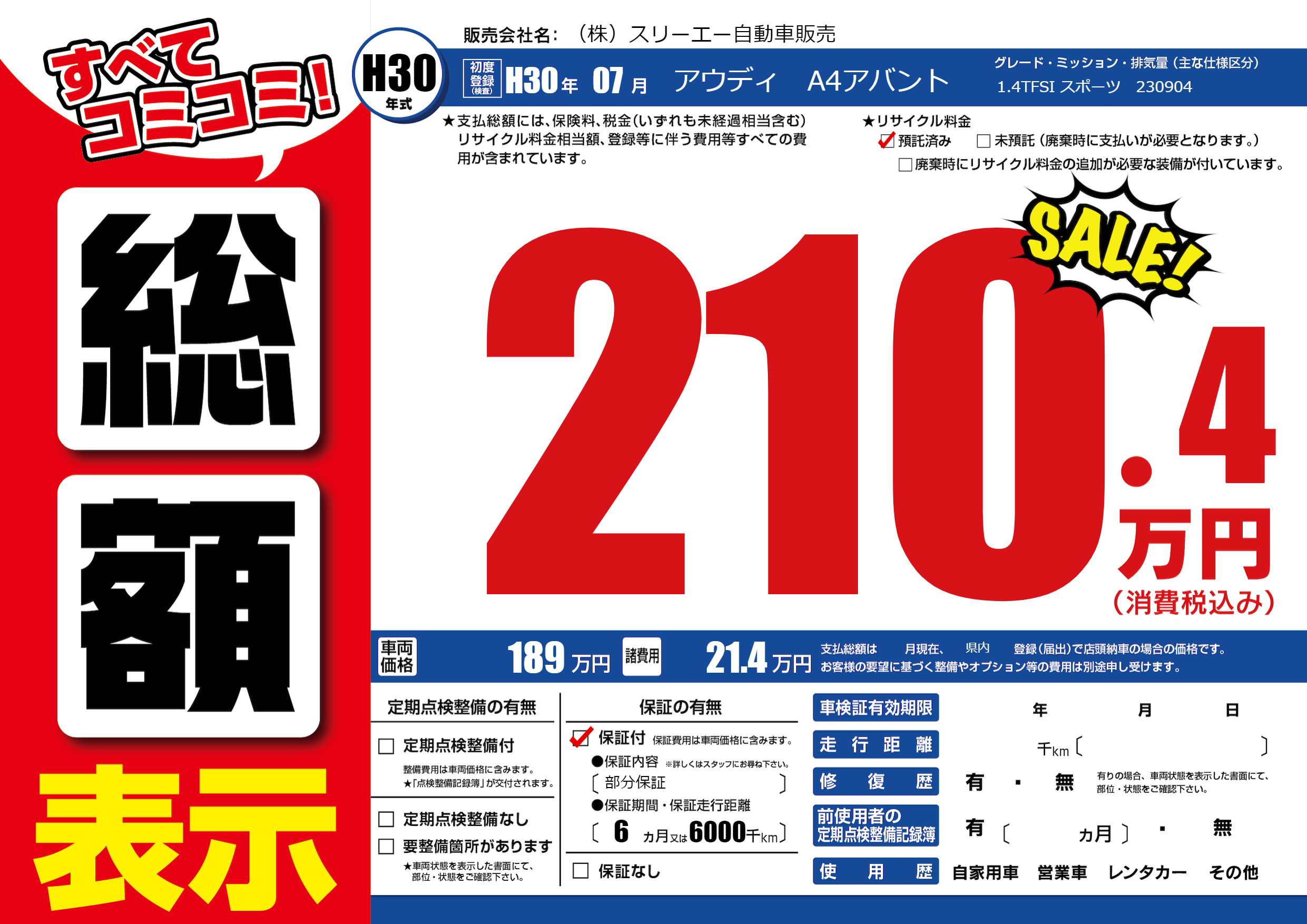 | 車名 | アウディ A4アバント | グレード ミッション 排気量 |