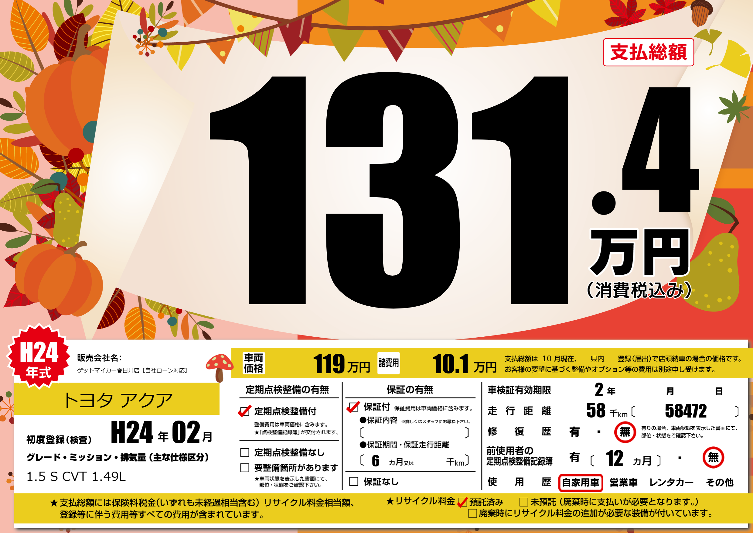 | 車名 | トヨタ アクア | グレード ミッション 排気量 |