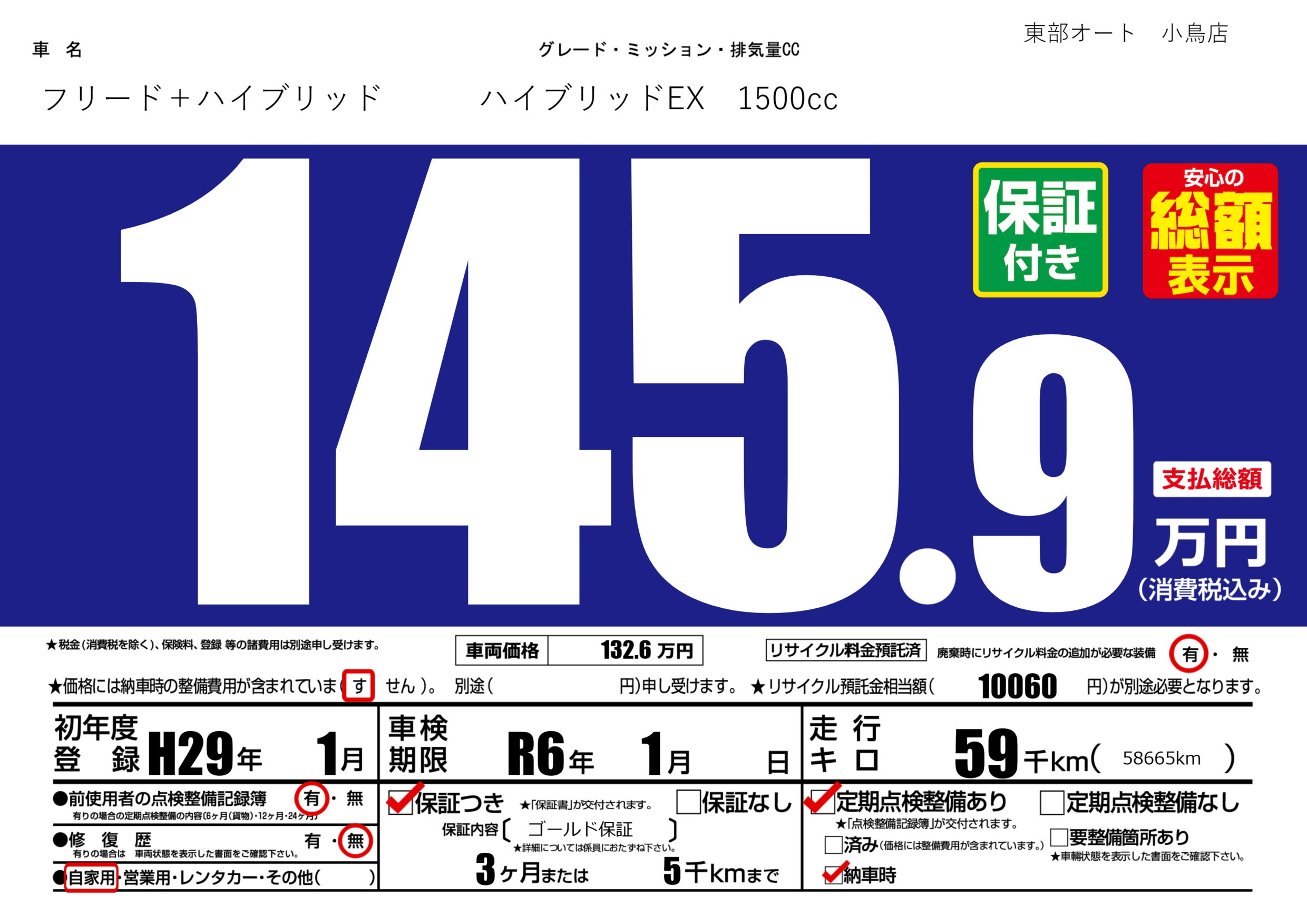 | 車名 | フリード+ハイブリッド | グレード ミッション 排気量 |