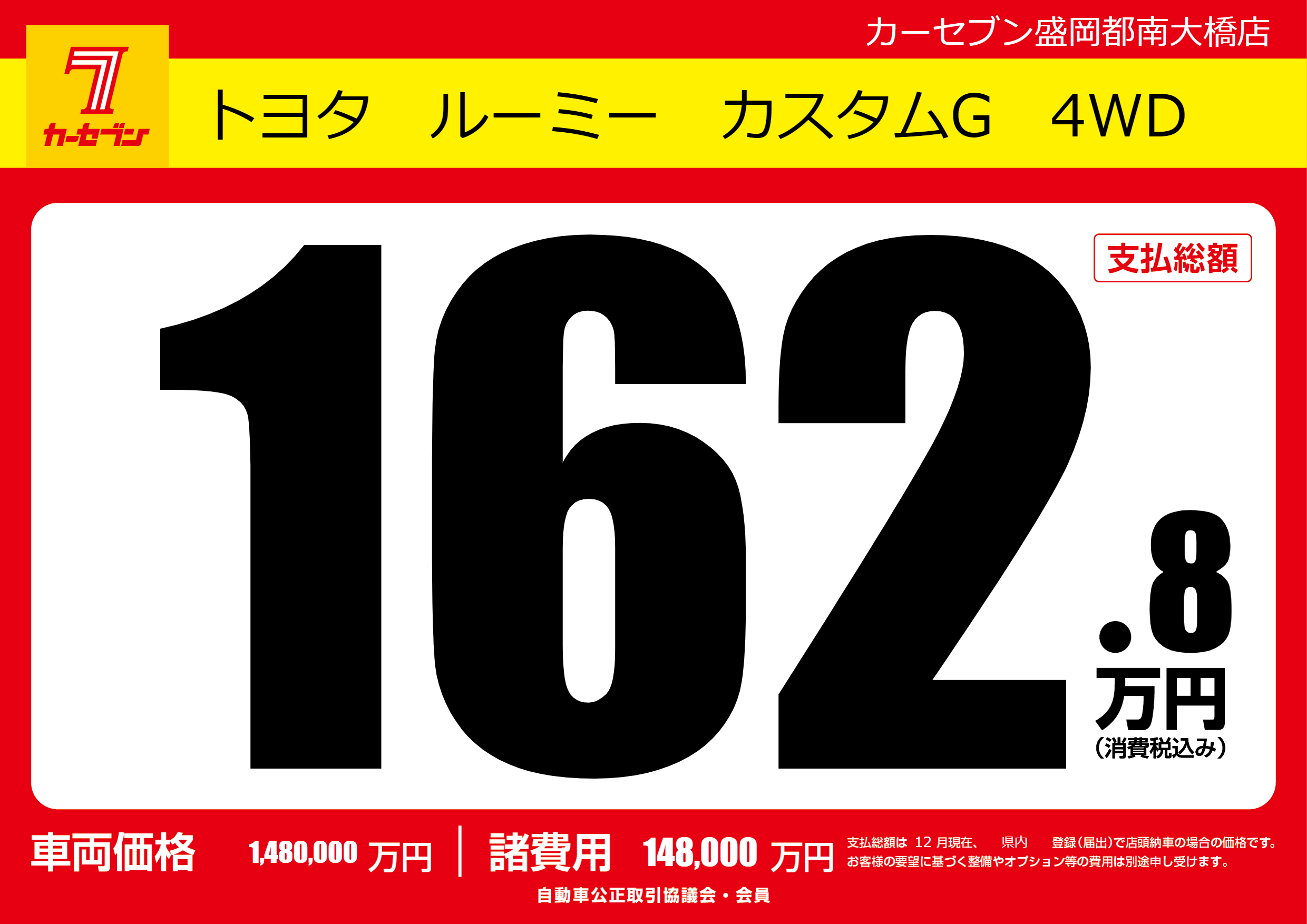 | 車名 | トヨタ ルーミー カスタムG 4WD | グレード ミッション 排気量 |