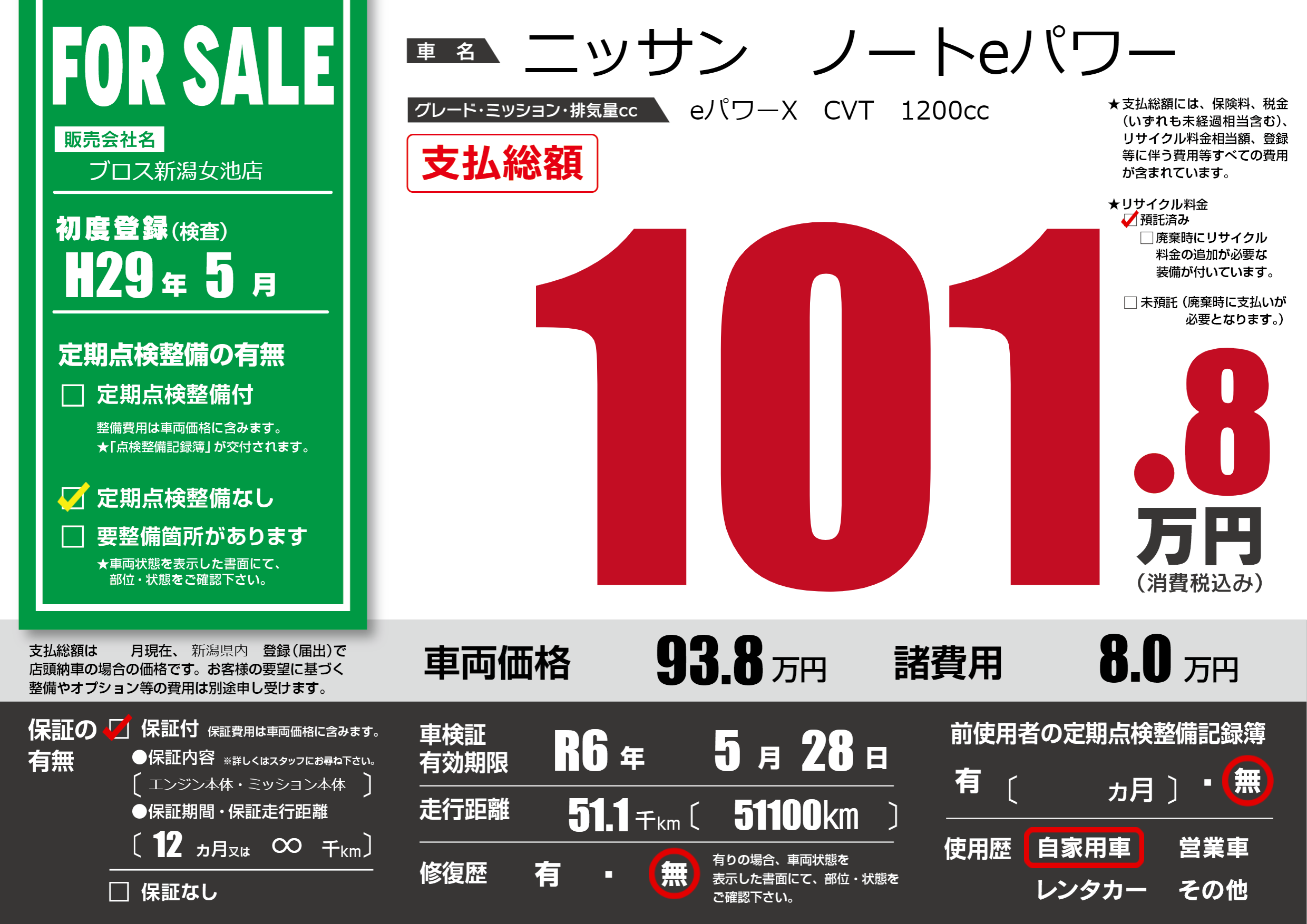 | 車名 | ニッサン ノートeパワー | グレード ミッション 排気量 |