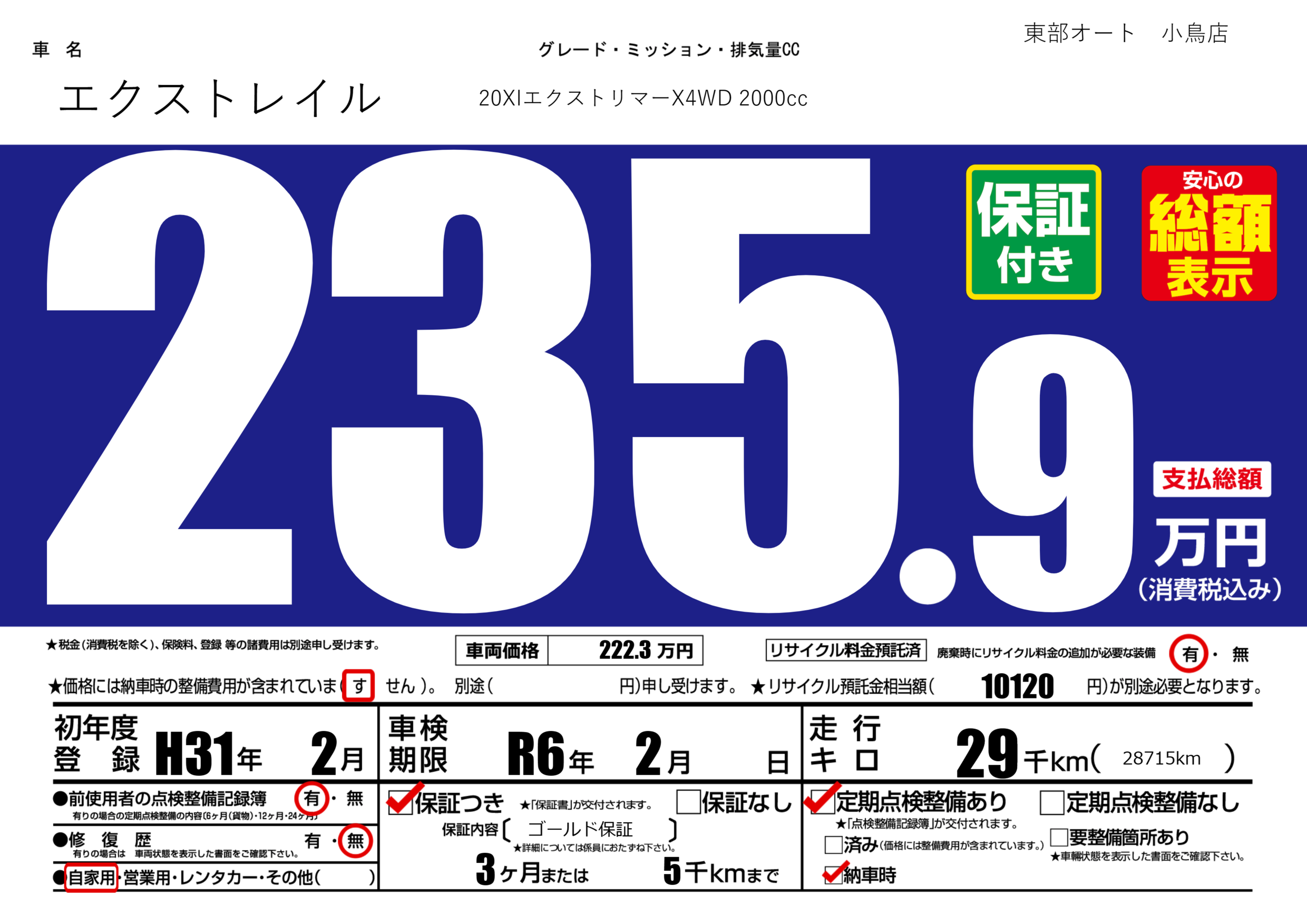 保証付き 保証内容( ゴールド保証) 3ヶ月または5千km |