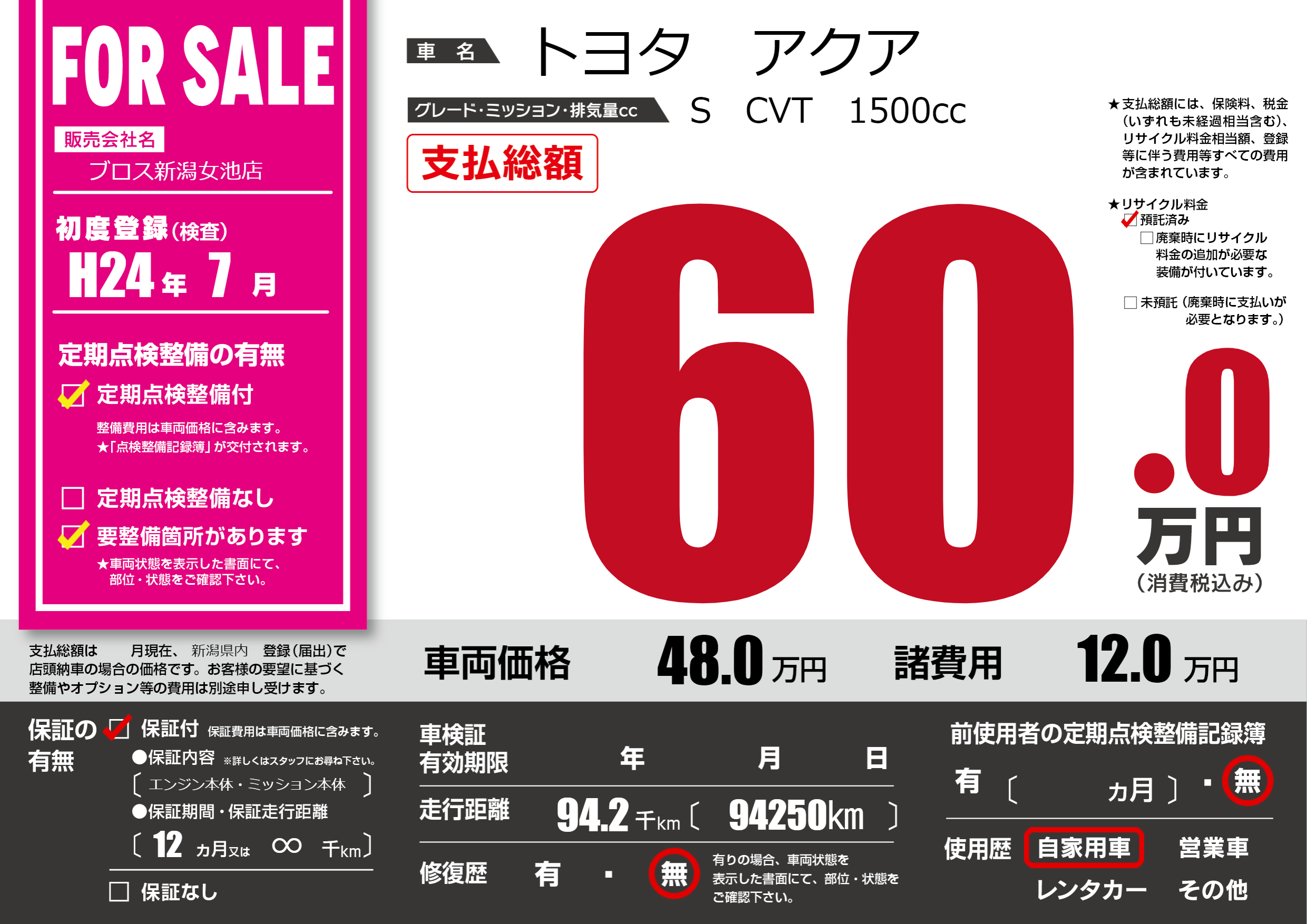 | 走行キロ | 9.4万km | 初年度登録 | H24年7月 |
