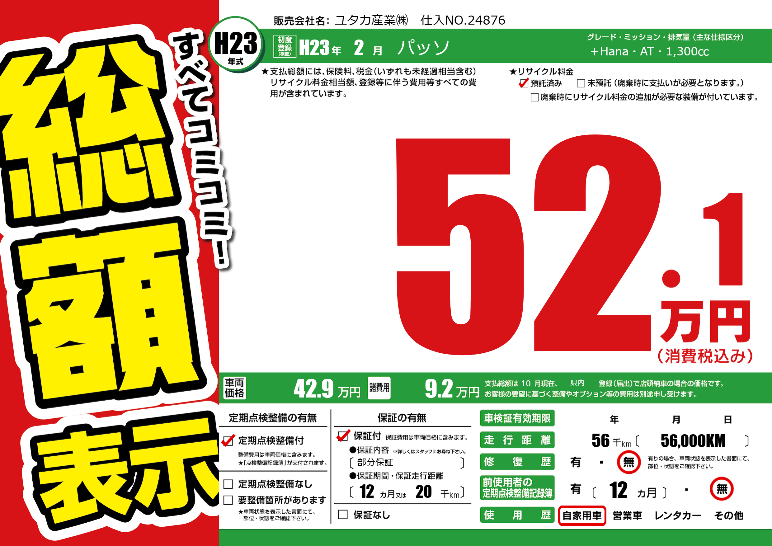 | 車名 | パッソ | グレード ミッション 排気量 |