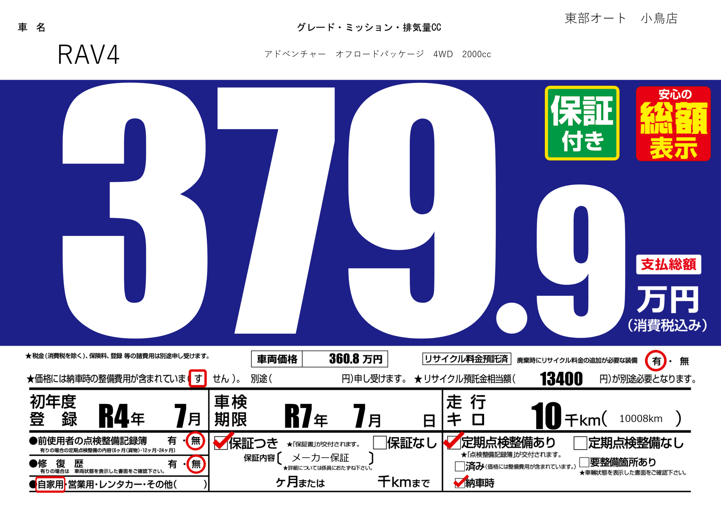 | 車名 | RAV4 | グレード ミッション 排気量 |