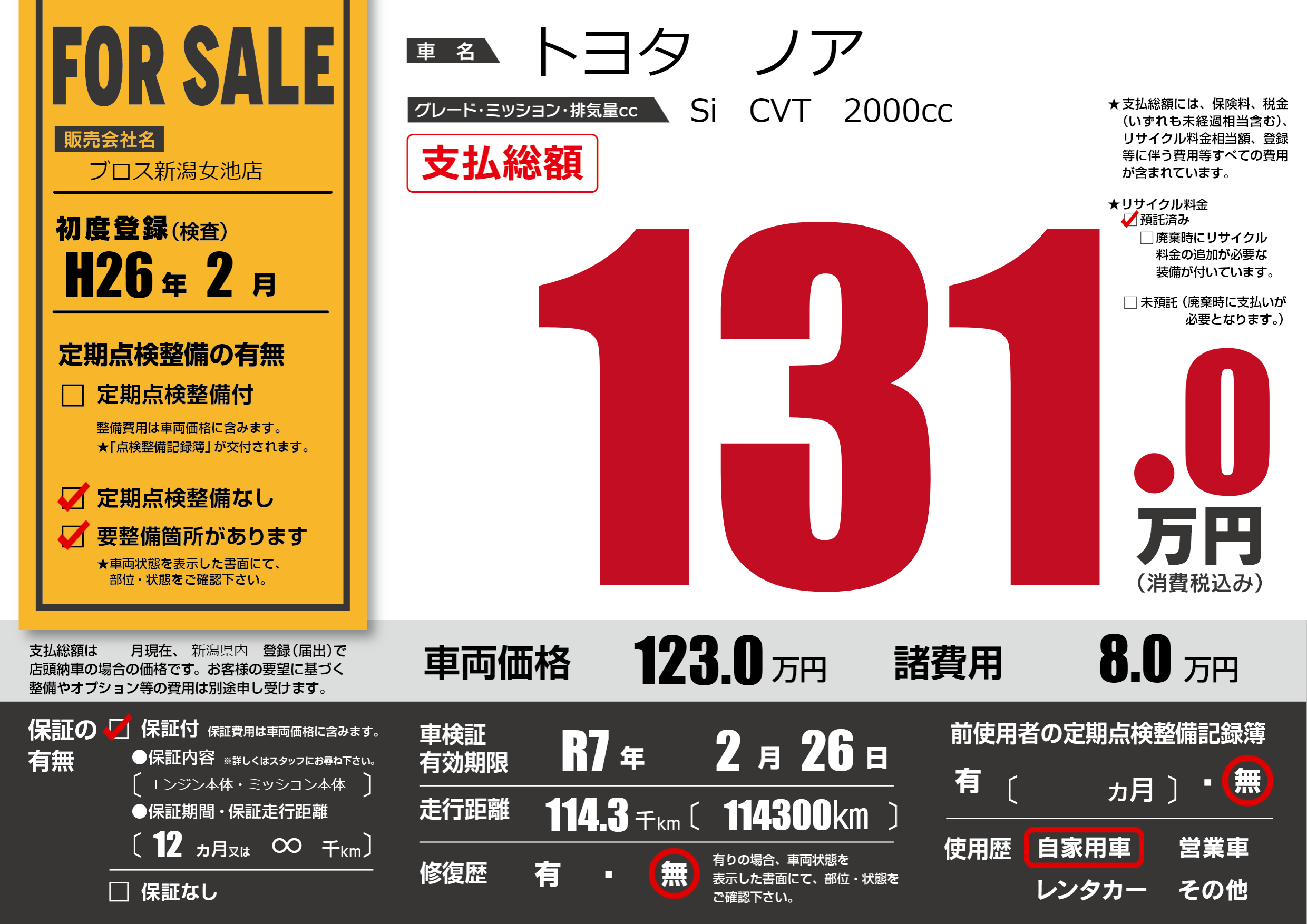 | 車名 | トヨタ ノア | グレード ミッション 排気量 |
