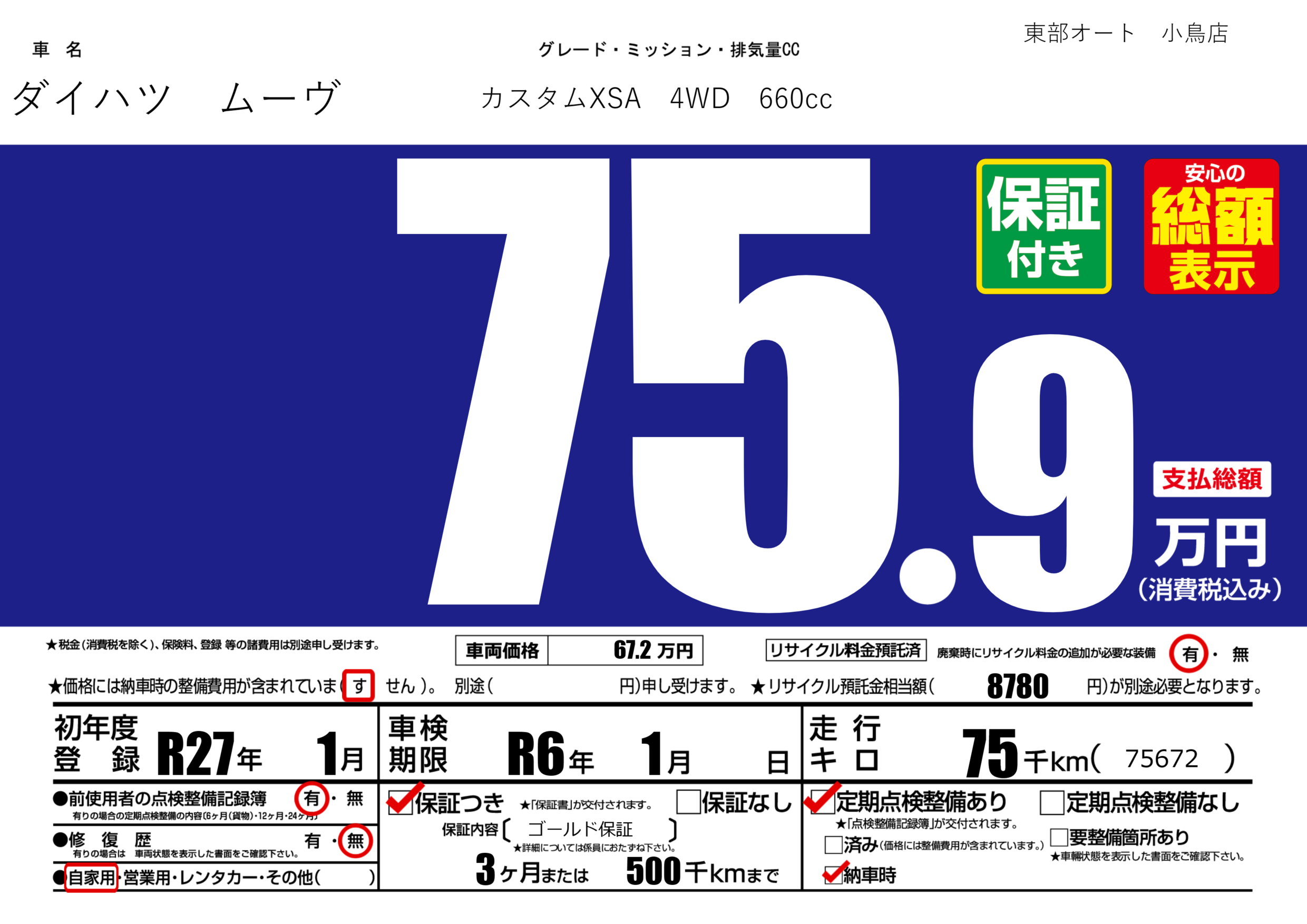 保証付き 保証内容( ゴールド保証) 3ヶ月または500千km |