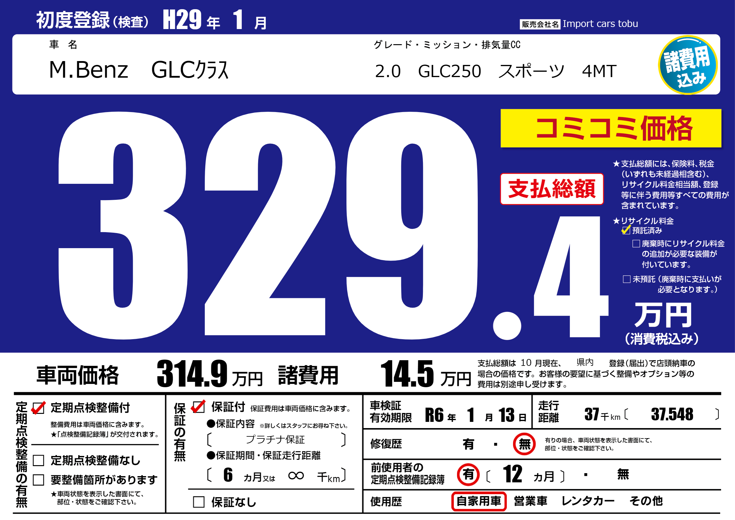 | 車名 | M.Benz GLCクラス | グレード ミッション 排気量 |