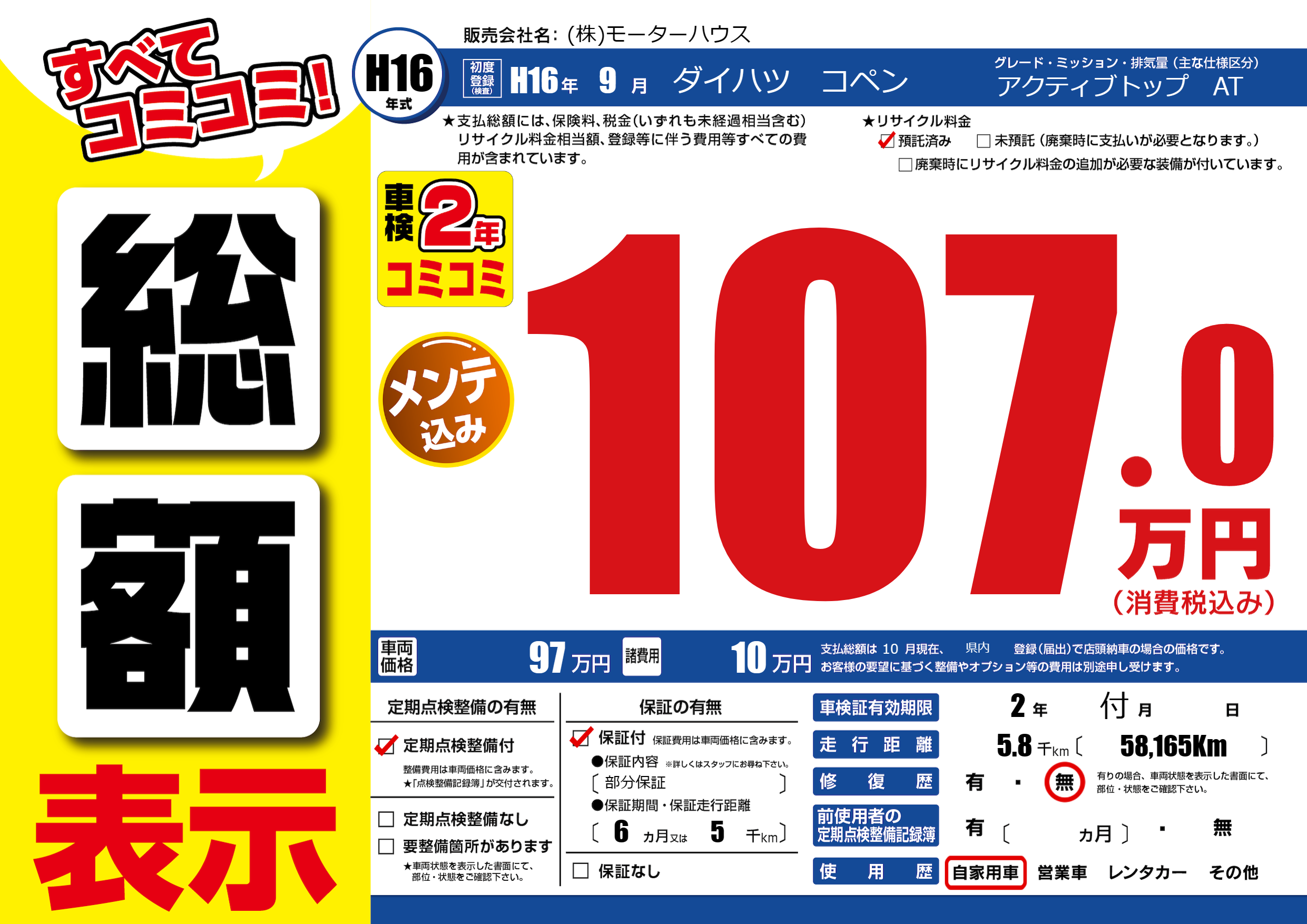 保証なし 保証内容(部分保証) 6ヶ月または(5)千kmまで |