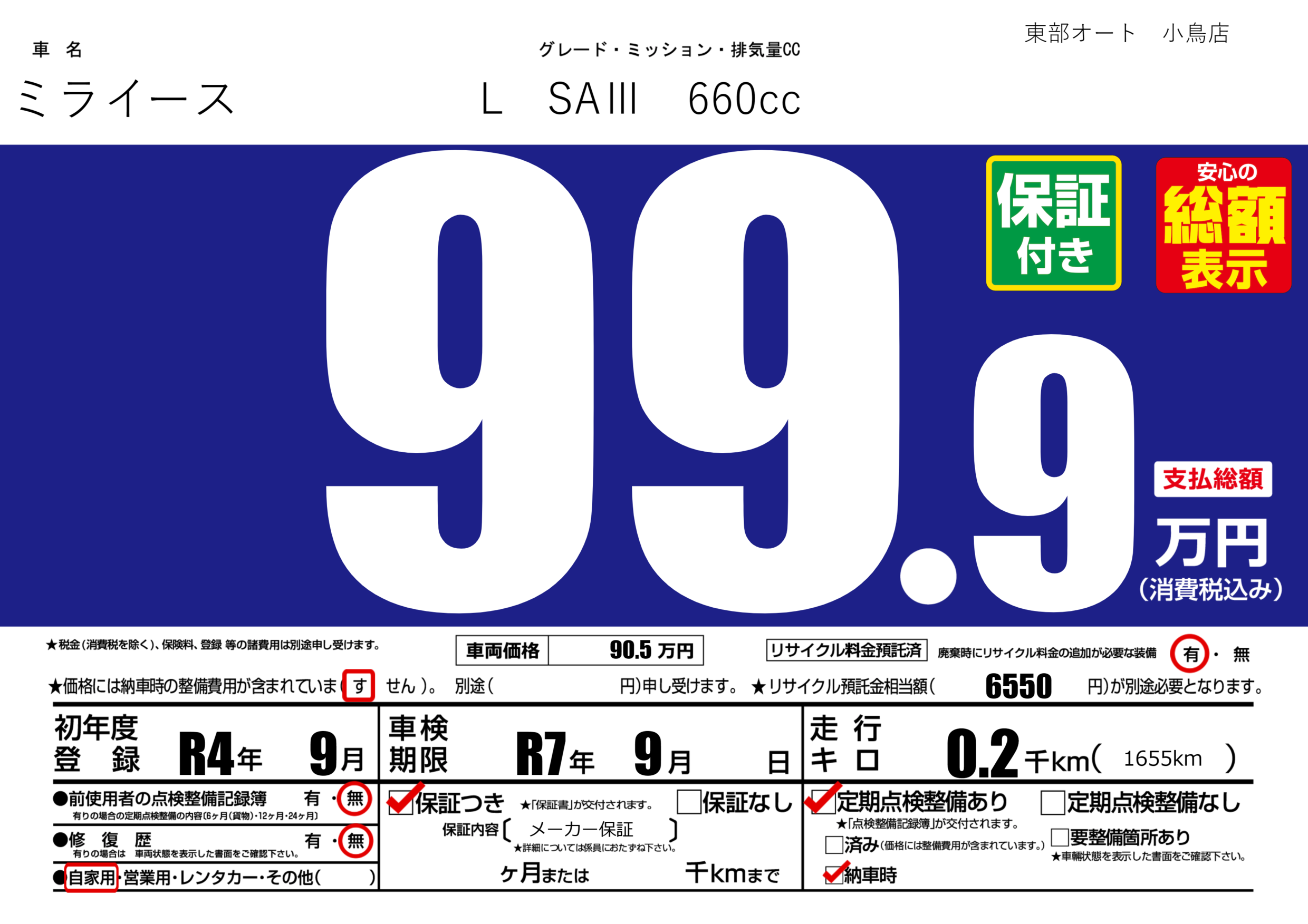 | 車検制限 | R7年 9月 - 日 | ||
